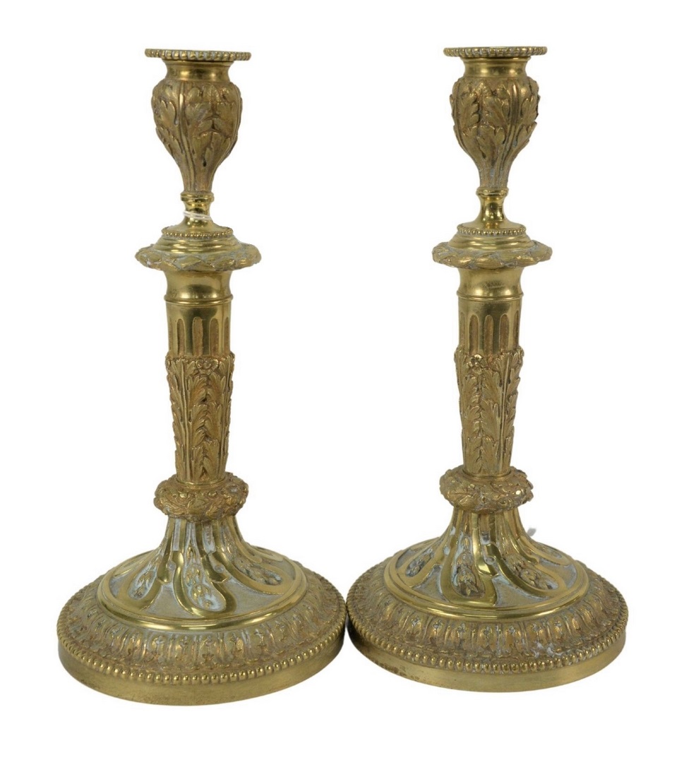 Pair of Louis XVI Style Gilt Candlesticks, foliate cast stem on round foot, with beaded border, height 11 inches. The Estate of Gloria Schiff, 630 Park Avenue, New York.