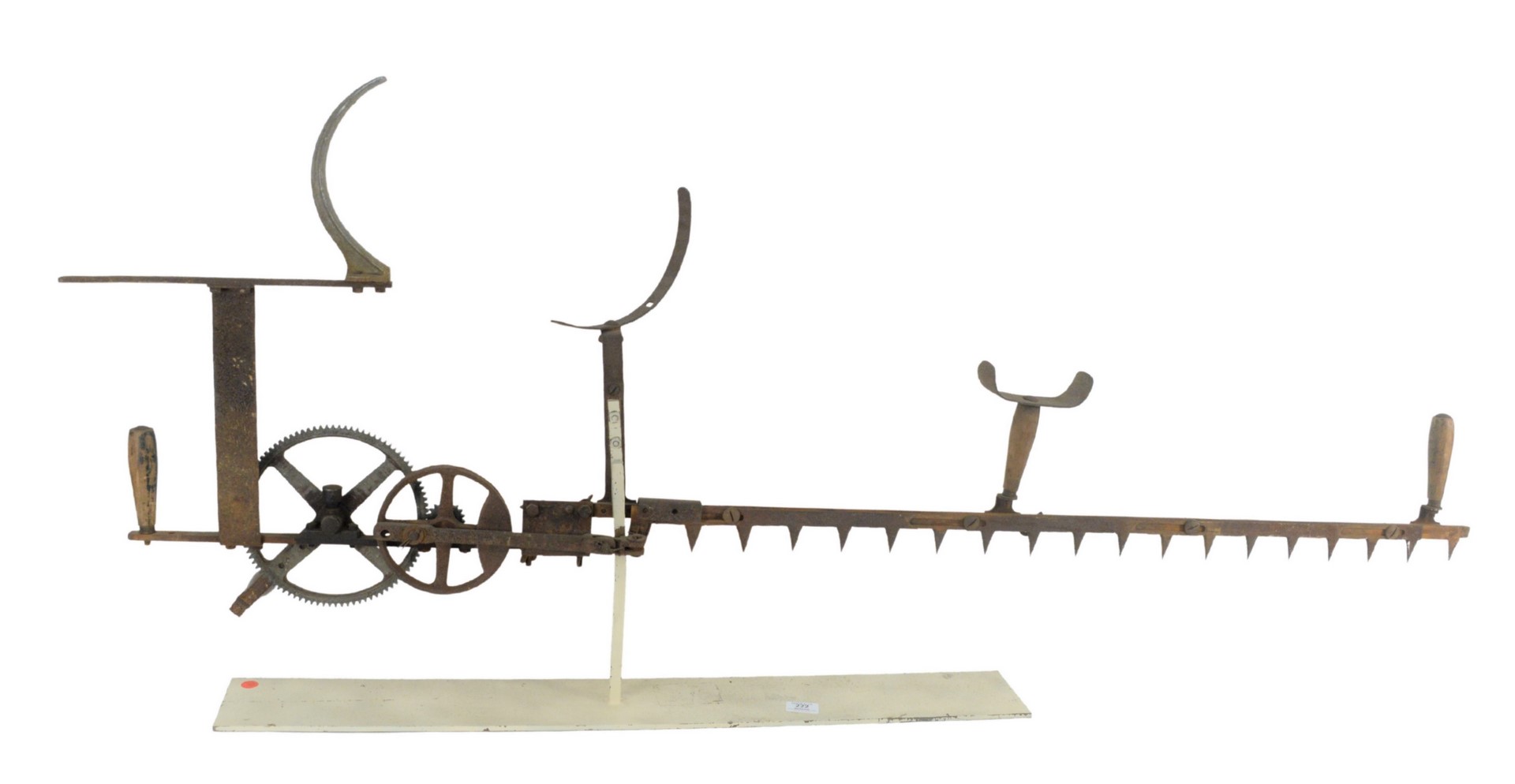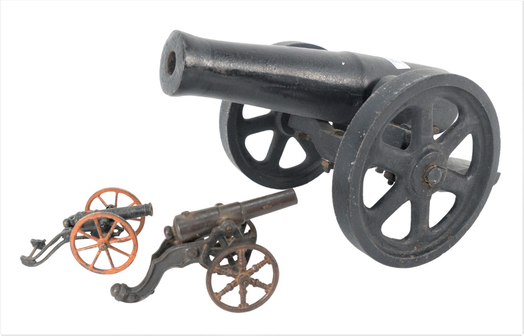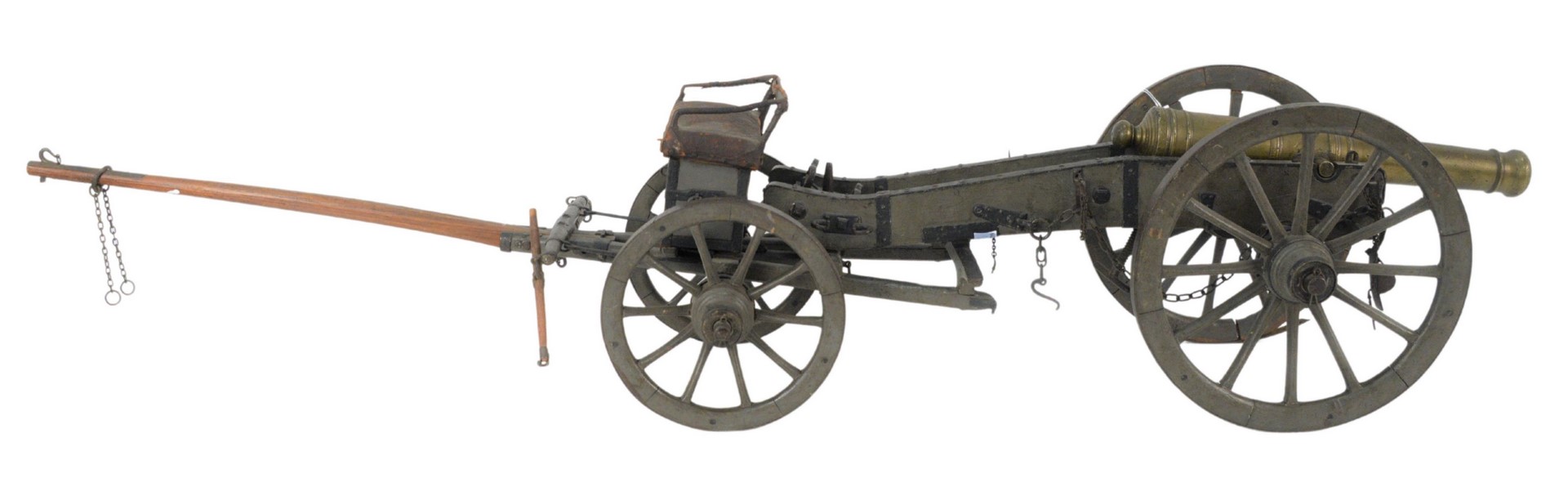French Model Field Cannon with Limber, made of iron and grey painted wood with ammo box, rare facing leather seat and heavy brass adjustable cannon, length 45 inches.