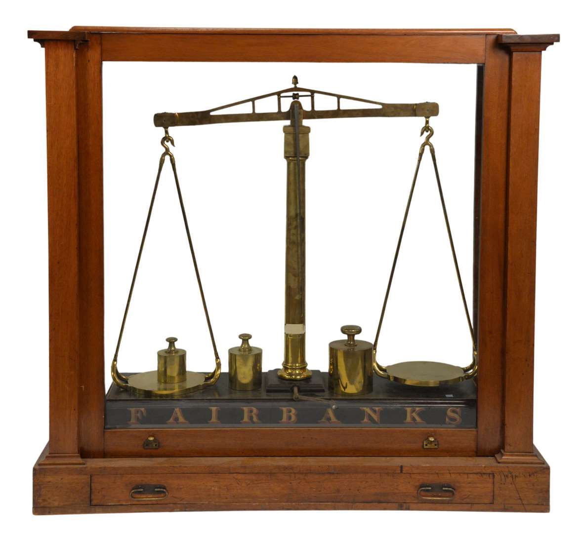 Monumental Fairbanks Balance Scale, brass balance supports and weights on iron painted base in oversized mahogany and glass case with drawer, height 4′ 3, width 4′ 7, depth 23.