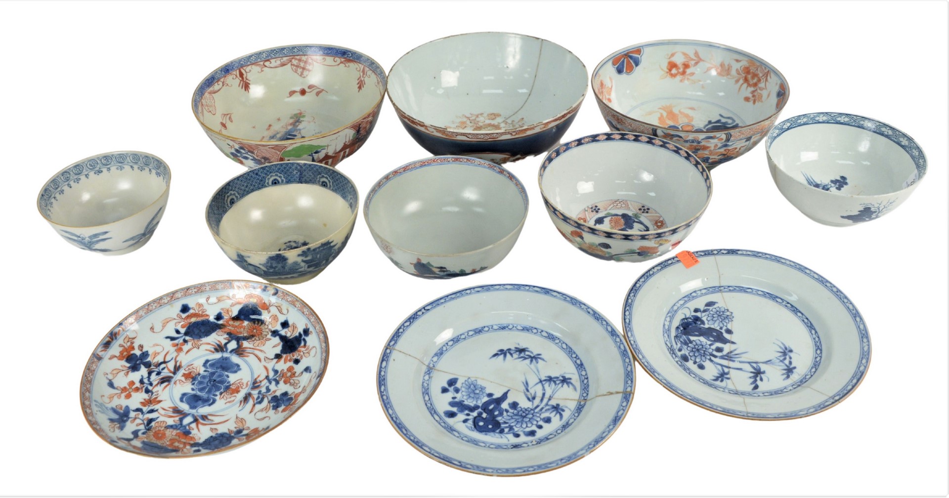 Eleven Piece Lot of Chinese Export to include various bowls and plates with repairs, largest height 4 inches, diameter 9 1/2 inches. Provenance: From a Newport, Rhode Island historic home, in the same family since 1761.