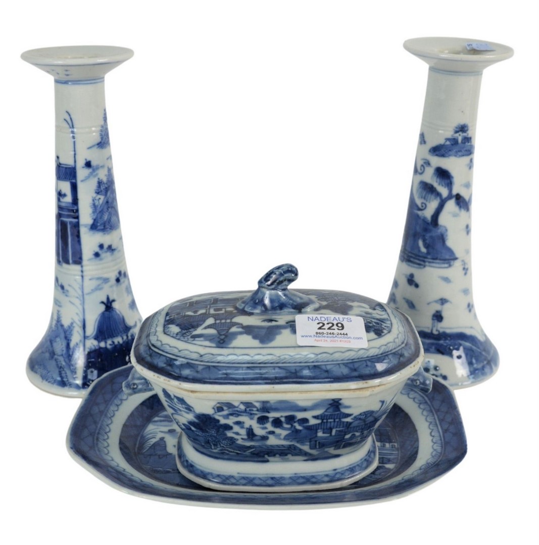 Twenty Piece lot of Canton to include a pair of candlesticks 2 covered pots beaker 2 creamers 4 salts 2 covered small tureens and underplates 3 small trays, minor chips, teapot height 9 1/2 inches. Provenance: From a Newport, Rhode Island historic home, in the same family since 1761.
