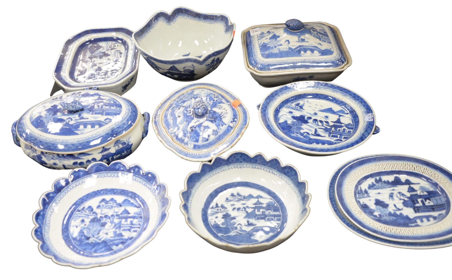 Ten Piece Lot of Canton, to include 3 covered vegetable dishes 2 warming plates 3 shaped bowls 2 reticulated small trays height of largest 4 1/2 inches diameter 9 1/2 inches. Provenance: From a Newport, Rhode Island historic home, in the same family since 1761.