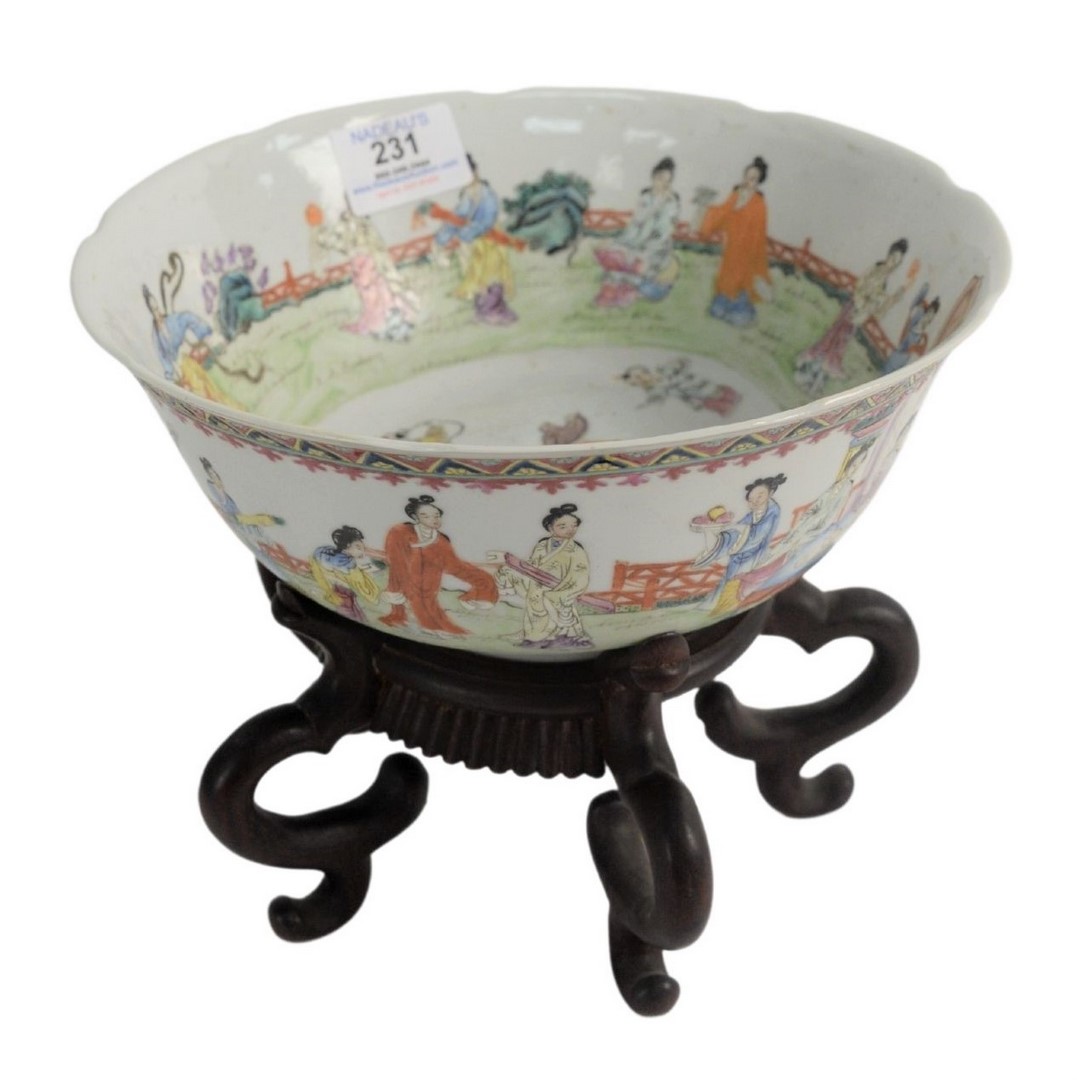 Famille Rose Scalloped Edged Bowl decorated with woman and boys at play outside with custom wood stand, 19th century, spurious Qianlong mark, diameter 9 inches.