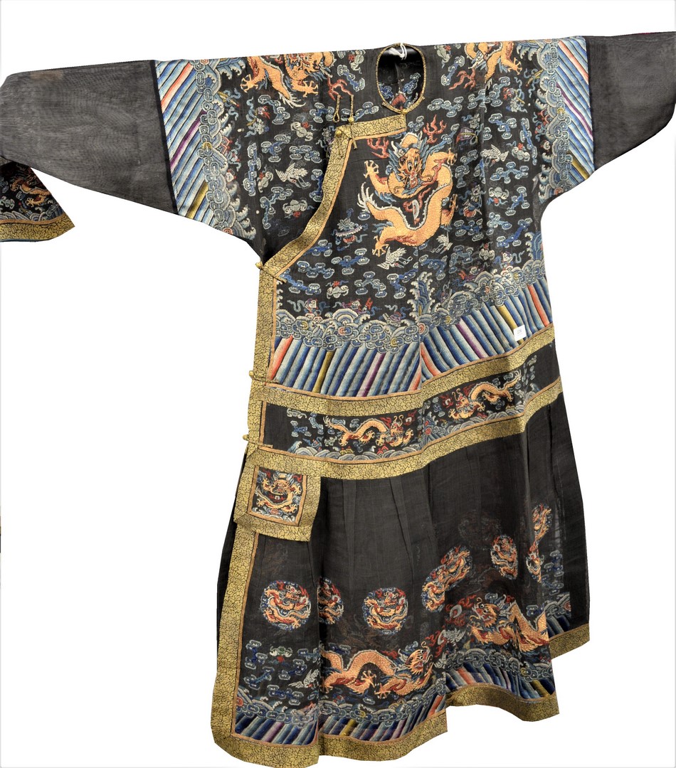 Chinese Embroidered Silk Dragon Robe depicting embroidered five claw dragons on the front and back with swirling flaming clouds, emblems, and bats on blue ground and black sleeves, length 56 inches.
