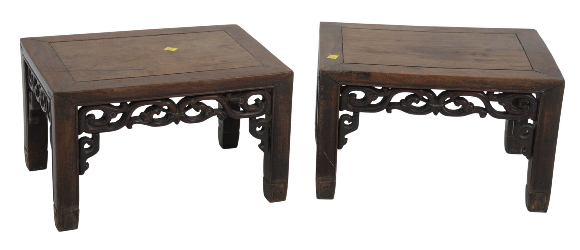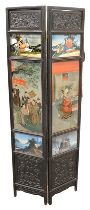 Chinese two panel folding screen, each panel having hardwood frame, two carved panels and three reverse paintings on glass, panels depicting figures and scholars. height 67 1/2 inches, each panel width 13 1/4 inches, total width 26 1/2 inches.