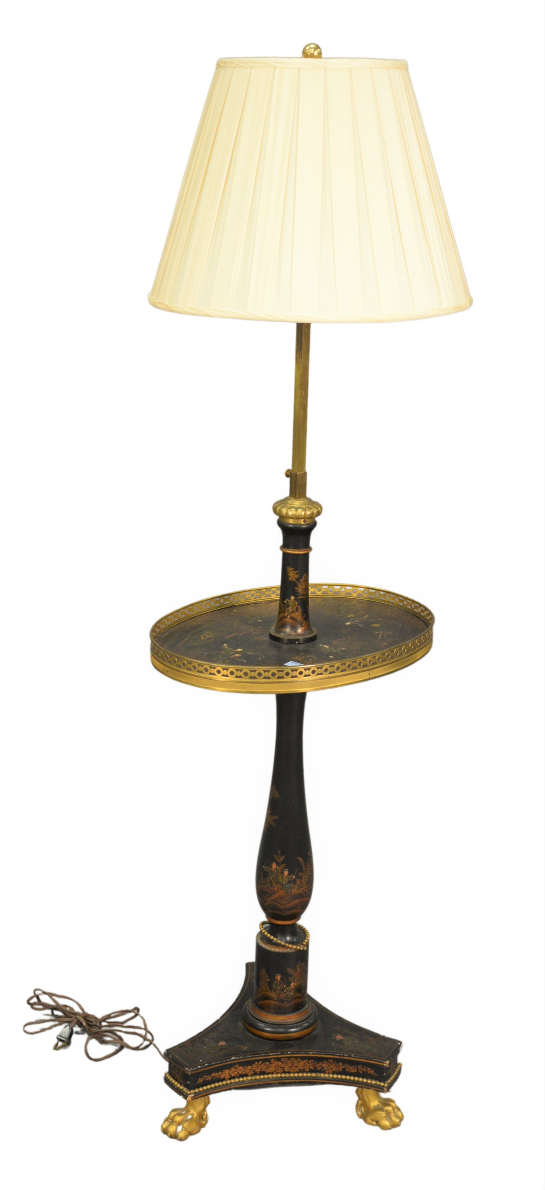 Dreyfous Registered Bridgelux Chinoiserie Floor Lamp Table having adjustable height with gilt metal mounts on gilt metal paw feet, shaft marked Dreyfous Registered Bridgelux, Paris, London, New York, approximate height 57 1/2 inches.