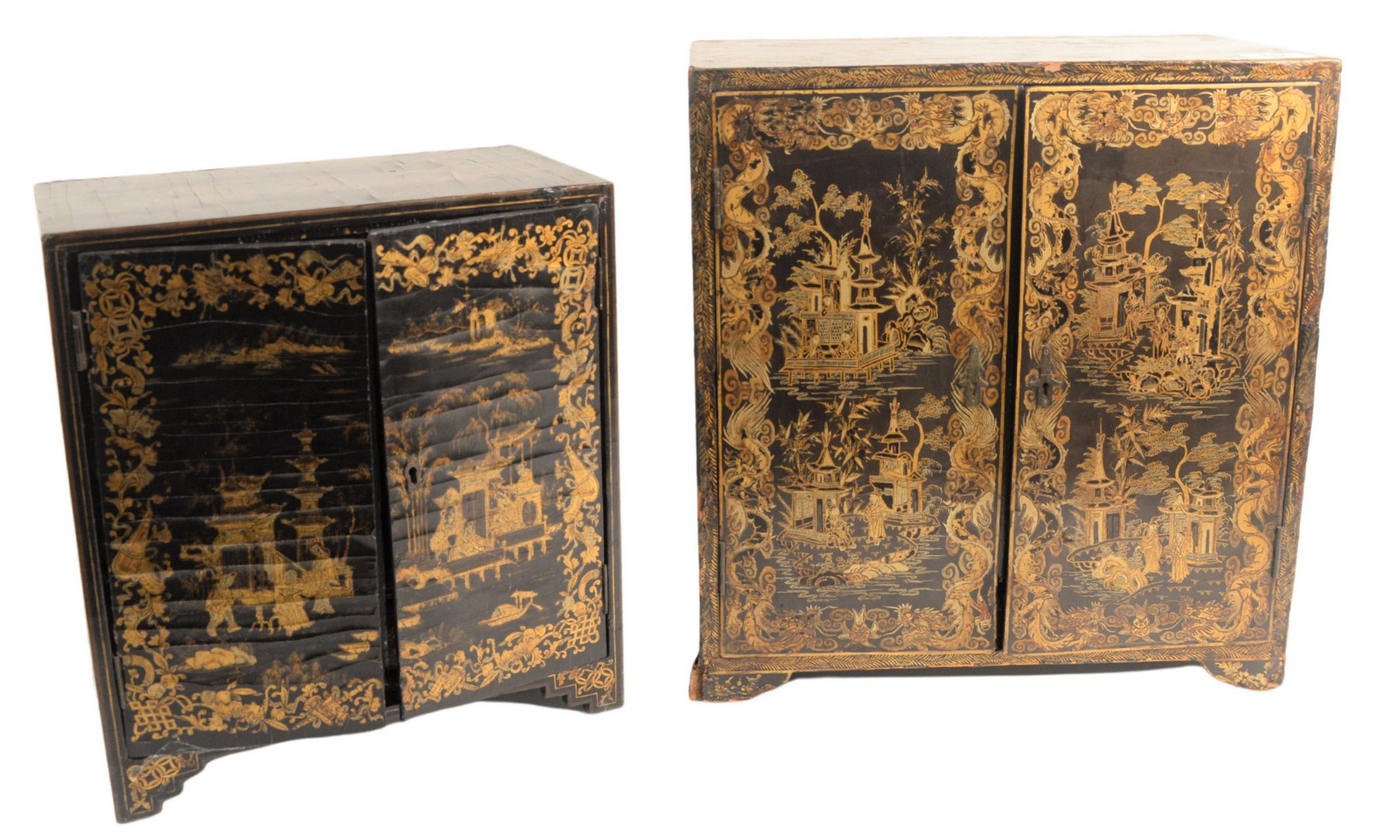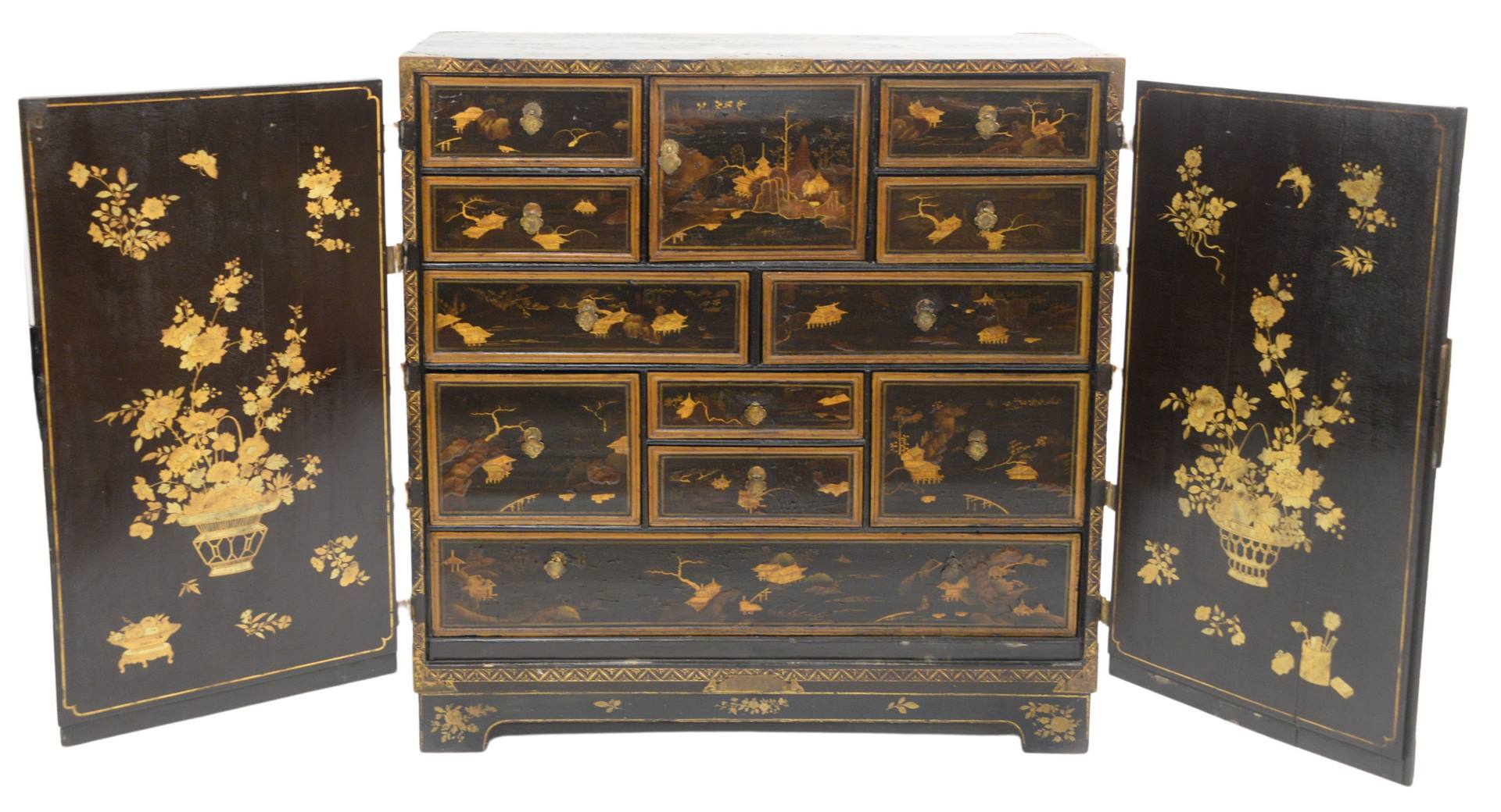 Chinese Chinoiserie Cabinet black lacquered having two doors opening to fitted interior with drawers and doors, all painted with landscape and scrolling vines with flowers, height 41 inches, width 40 inches, depth 20 inches.