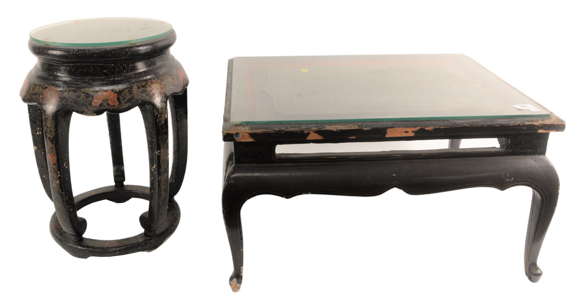 Two Black Lacquered Stands, rectangle having painted landscape and small round having painted flowers, height 14 1/2 inches width 25 1/2 inches, height 20 inches diameter 12 1/2 inches.
