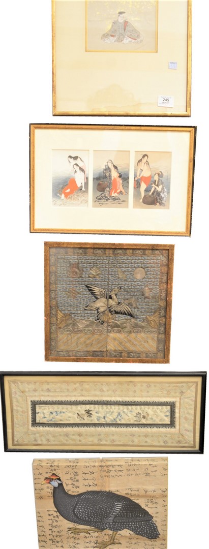 Group of Eight Framed Asian Items to include an embroidered crane badge with silver and gold threads, a silk embroidered sleeve with fish, a Japanese diptych, two triptychs, two woodblock prints, along with a watercolor on paper, largest frame size 33 x 12 1/2. Provenance: The Estate of Alan Gans, Mulberry Point, Guilford.