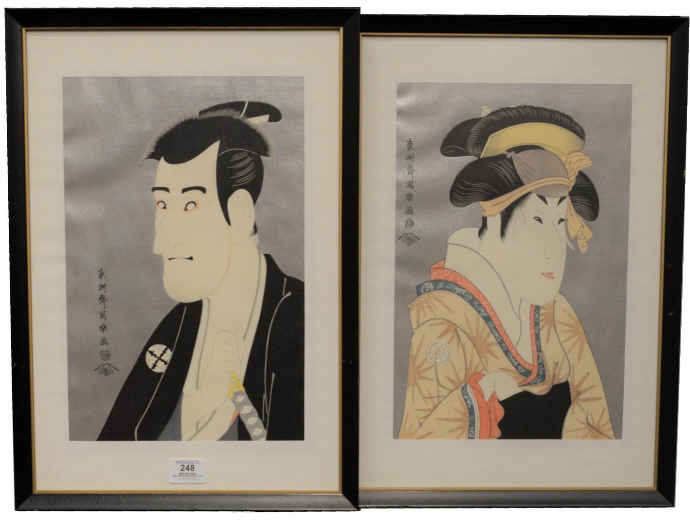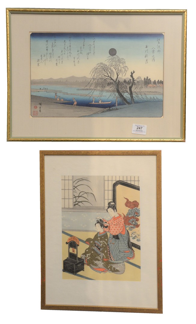 Group of Six Japanese Woodblock Prints to include one Ando Hiroshige, Fifty-three Stations on the Tokaido, along with a landscape, three interior scenes, and one figure seated in snow, largest sight size 10 1/2 x 13 1/2.