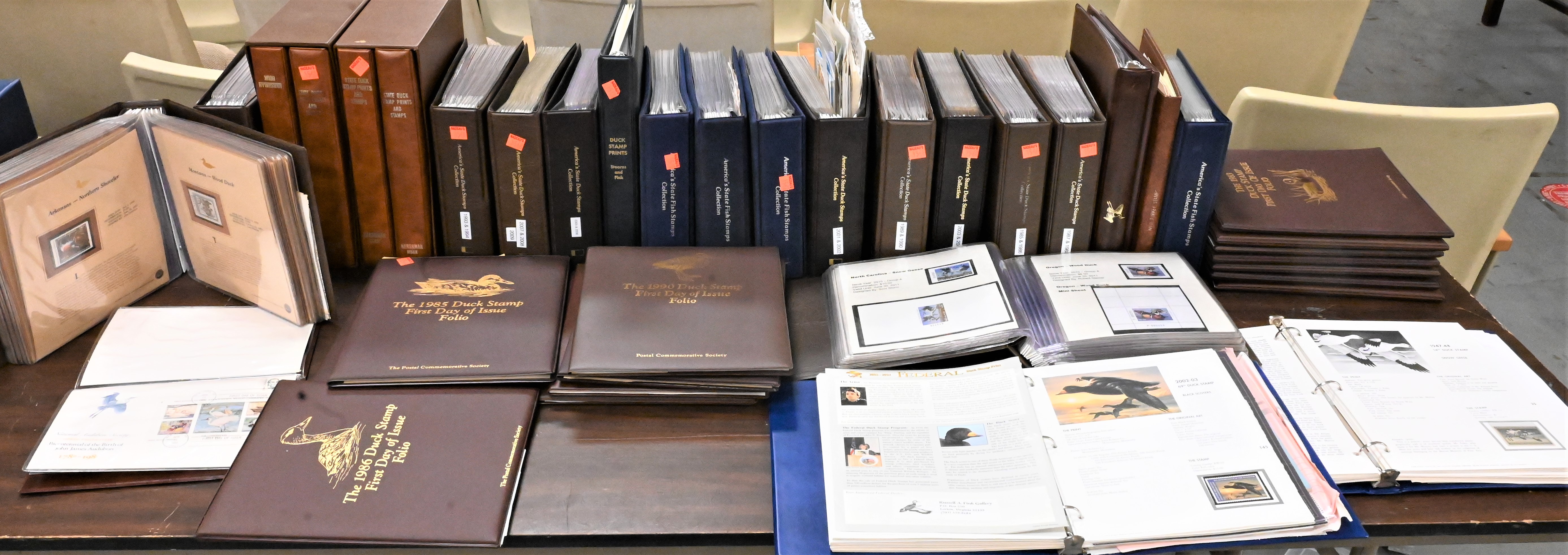 Large Collection of United States State and Federal Duck Stamps, stamps are mint and used in albums, folios and loose. State stamps range from 1990’s to present while Federal stamps start with RWI, also included are albums of State fish stamps