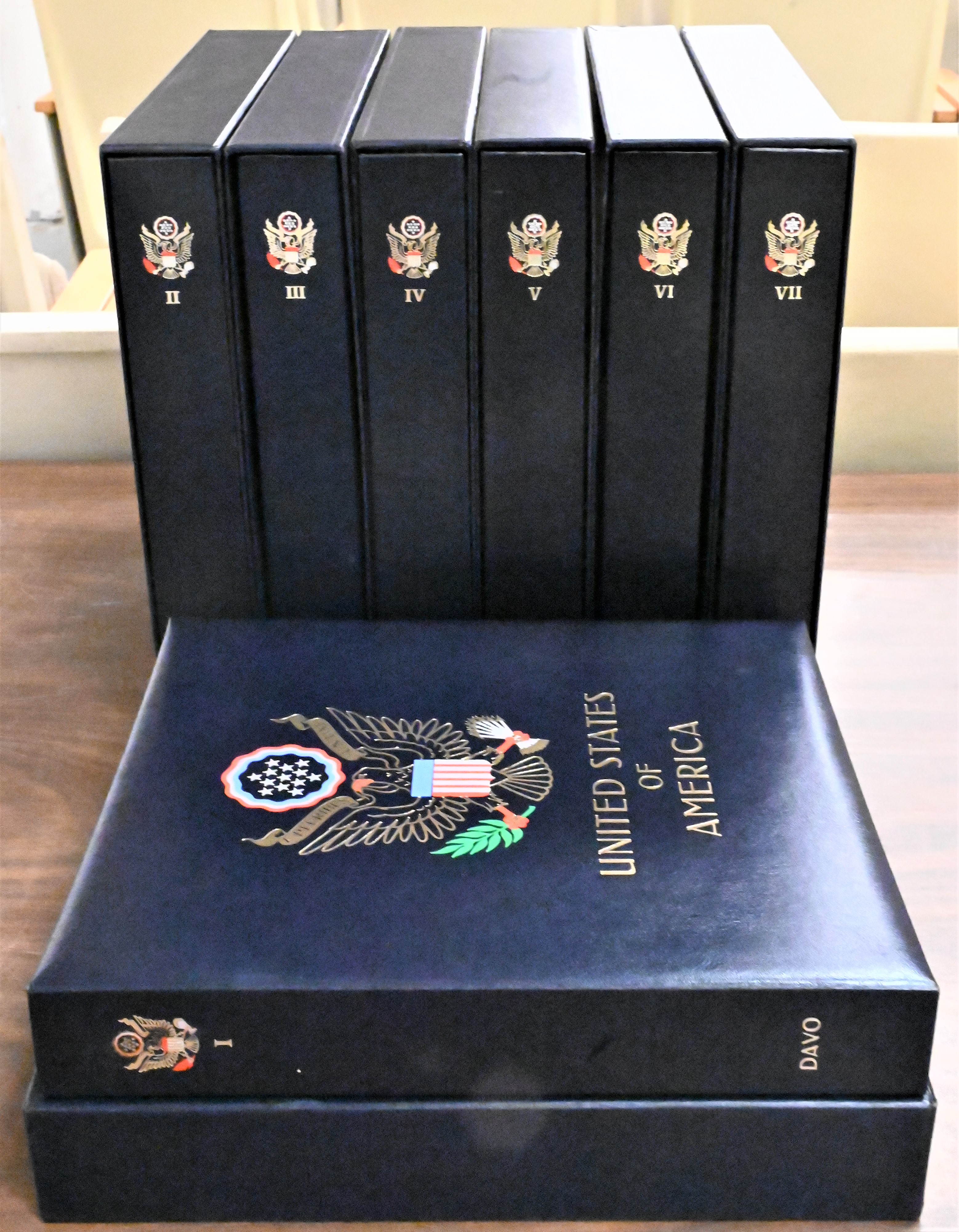 Seven Davo United States Hingeless Stamp Albums with Slipcovers, album pages span from 1847 – on, albums are in excellent condition and only contain a few modern stamps