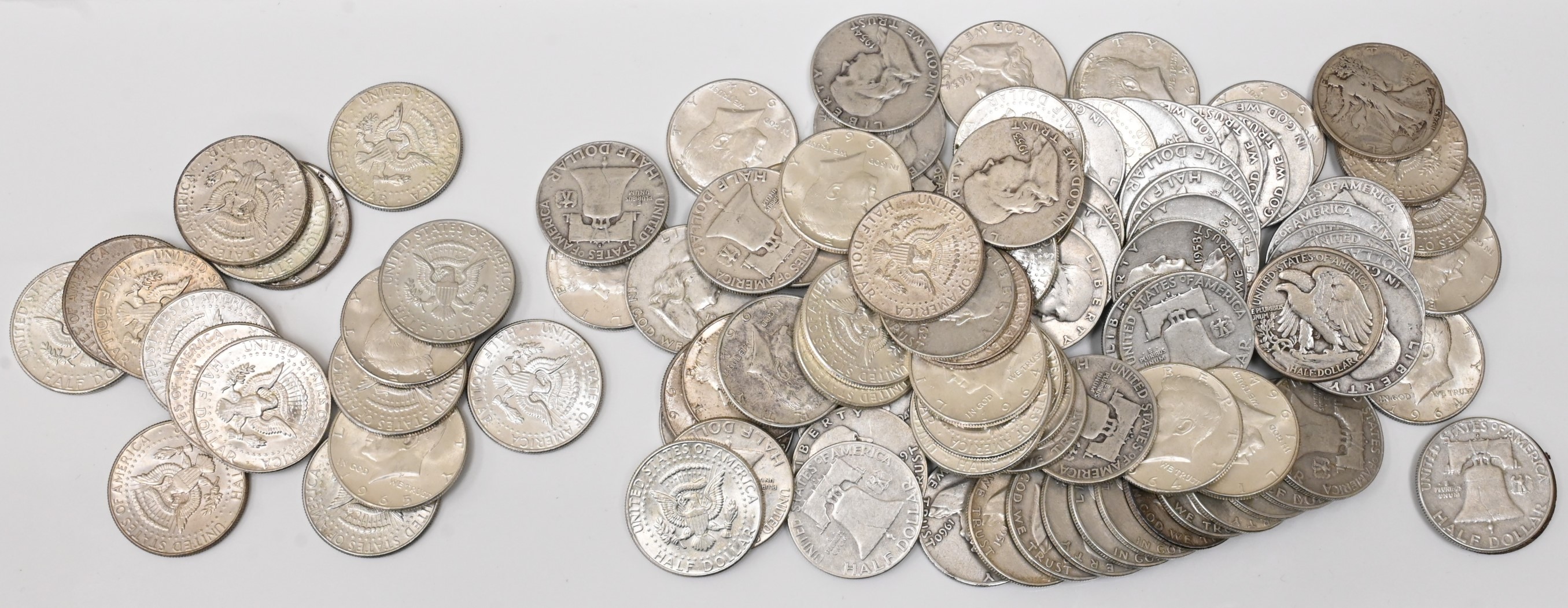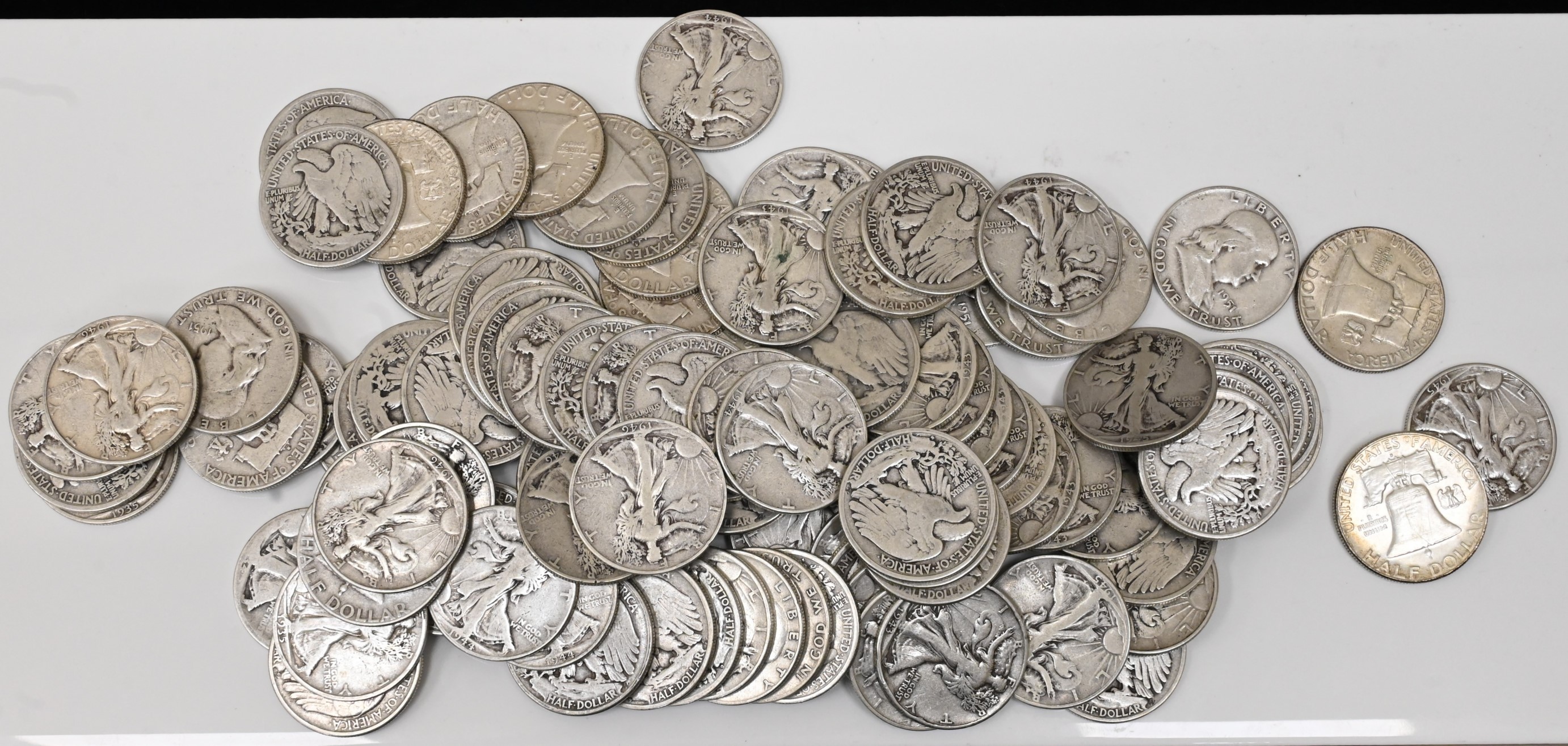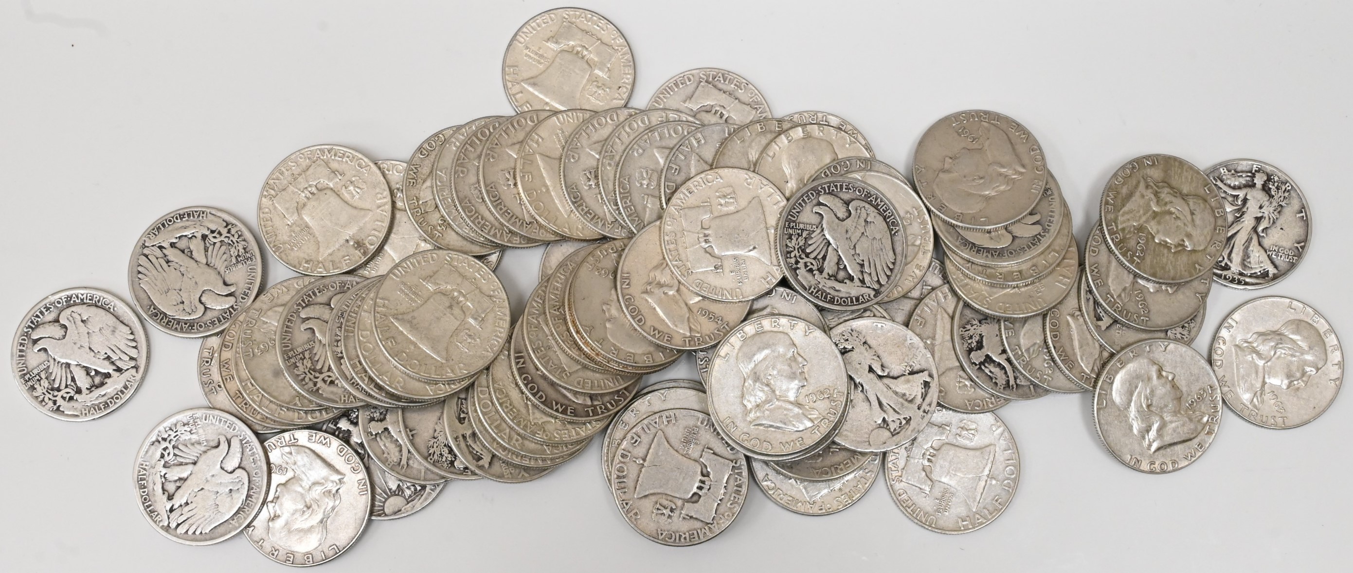 Coin Lot of U.S. 90% Silver Half Dollars, to include U.S. 90% silver half dollars, along with 40% halves comprising of twenty 1964 halfs, six walking Liberty halves, along with 40% halves.