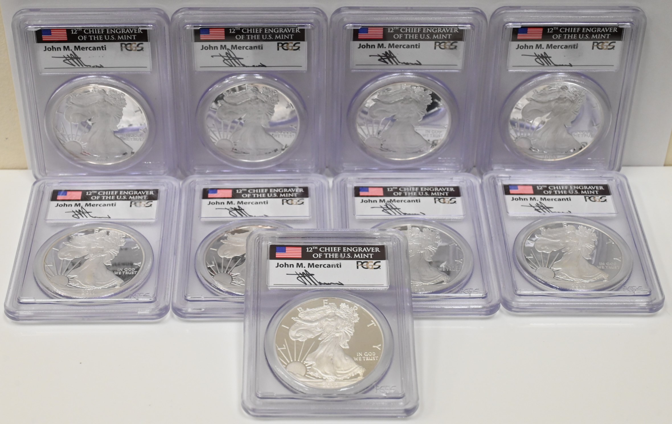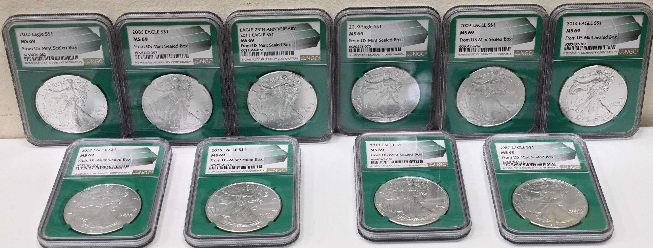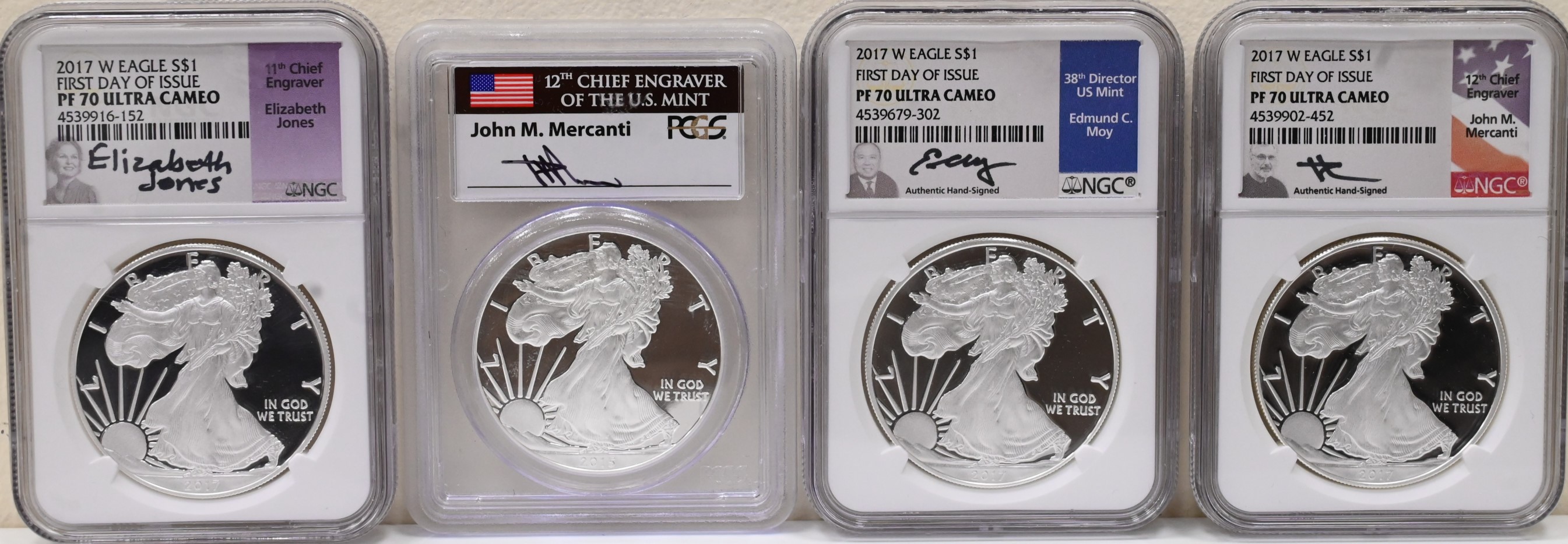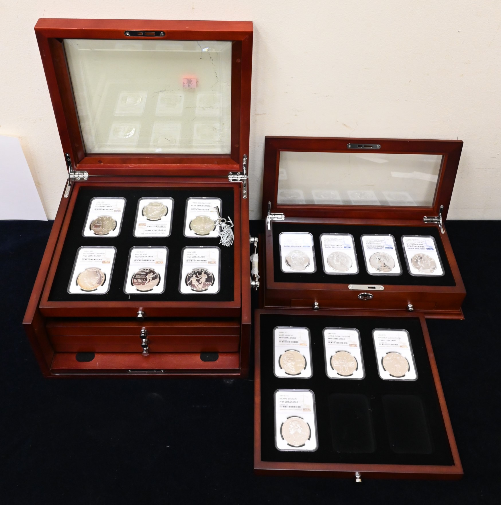 14 Piece Silver Coin Lot, to include presentation case with modern U.S. dollars commemorative all NGC Proof 69 Ultra Cameo, also 4 piece box with NGC MS70 Silver commemoratives, plus 10 pieces of Statue of Liberty commemoratives, In proof.