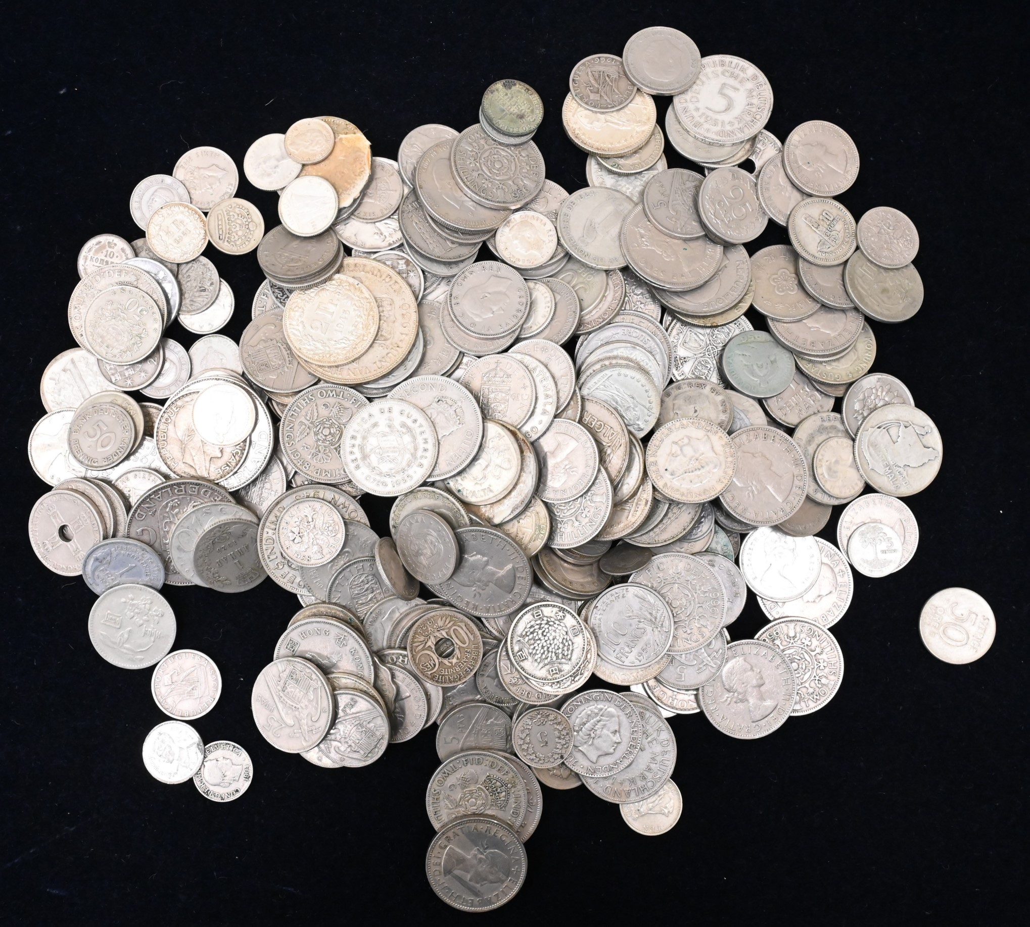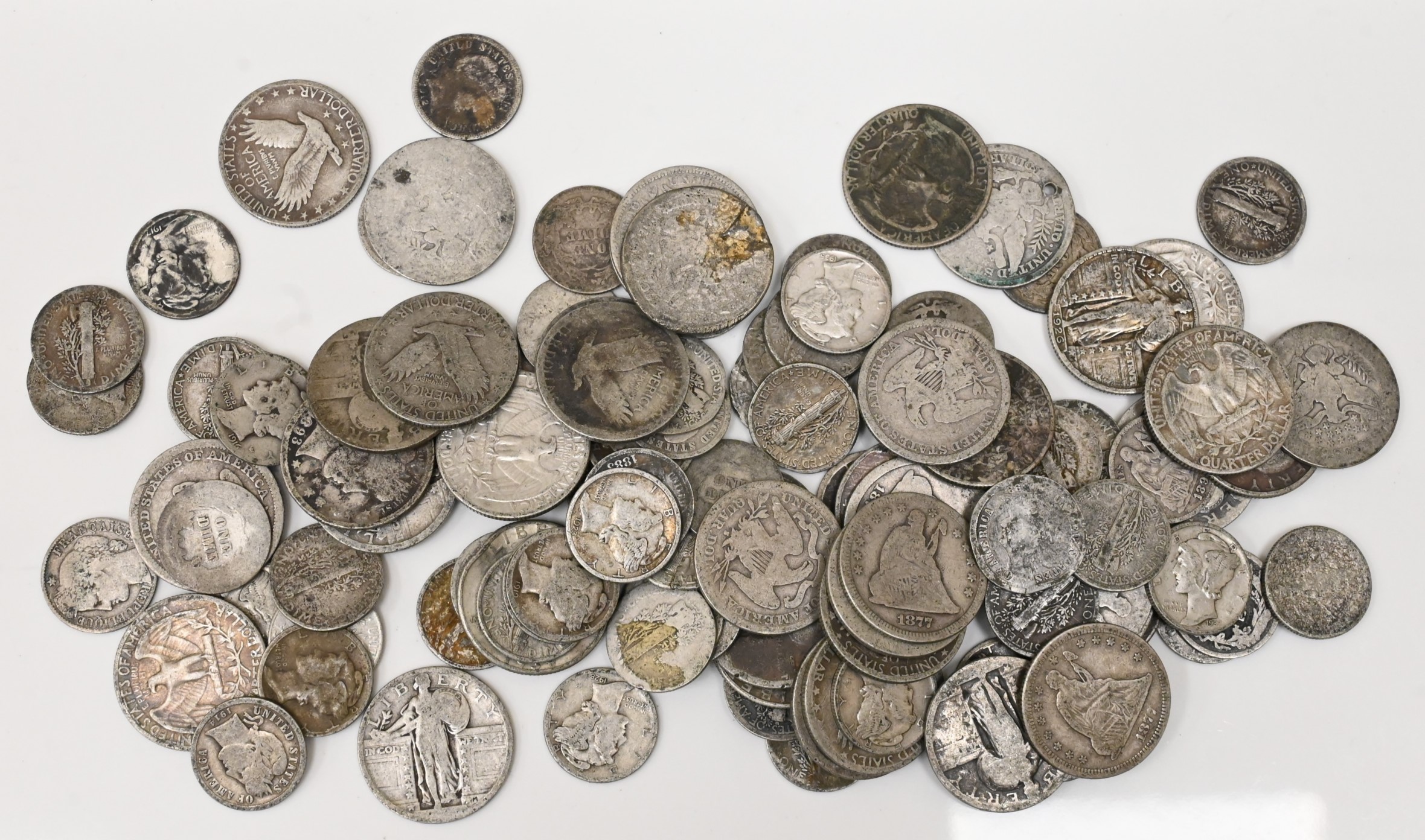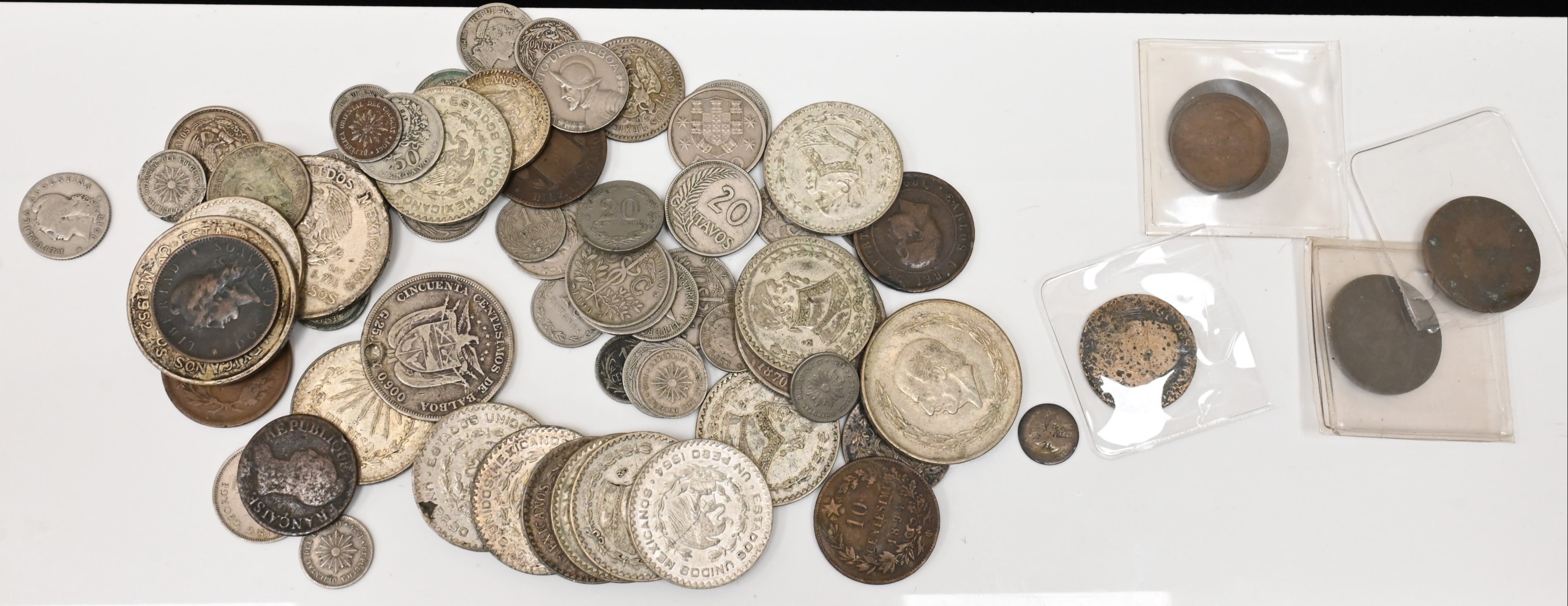 Mixed Mexican, Central and South American Silver and Copper Coins, to include 1870 uncirculated pesos (90%), 10 Mexican uncirculated pesos (10%), total weight 15.5 t.oz.