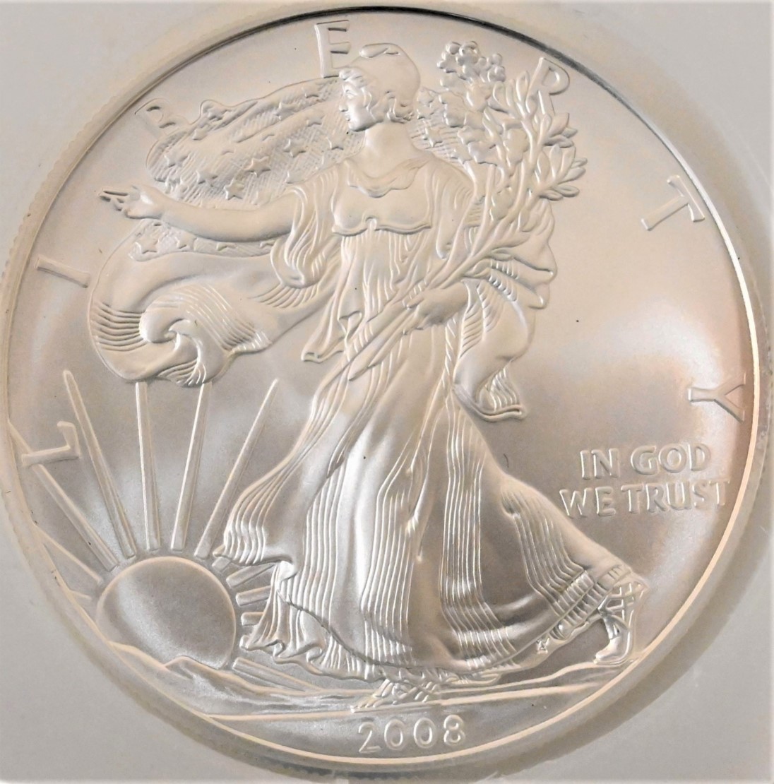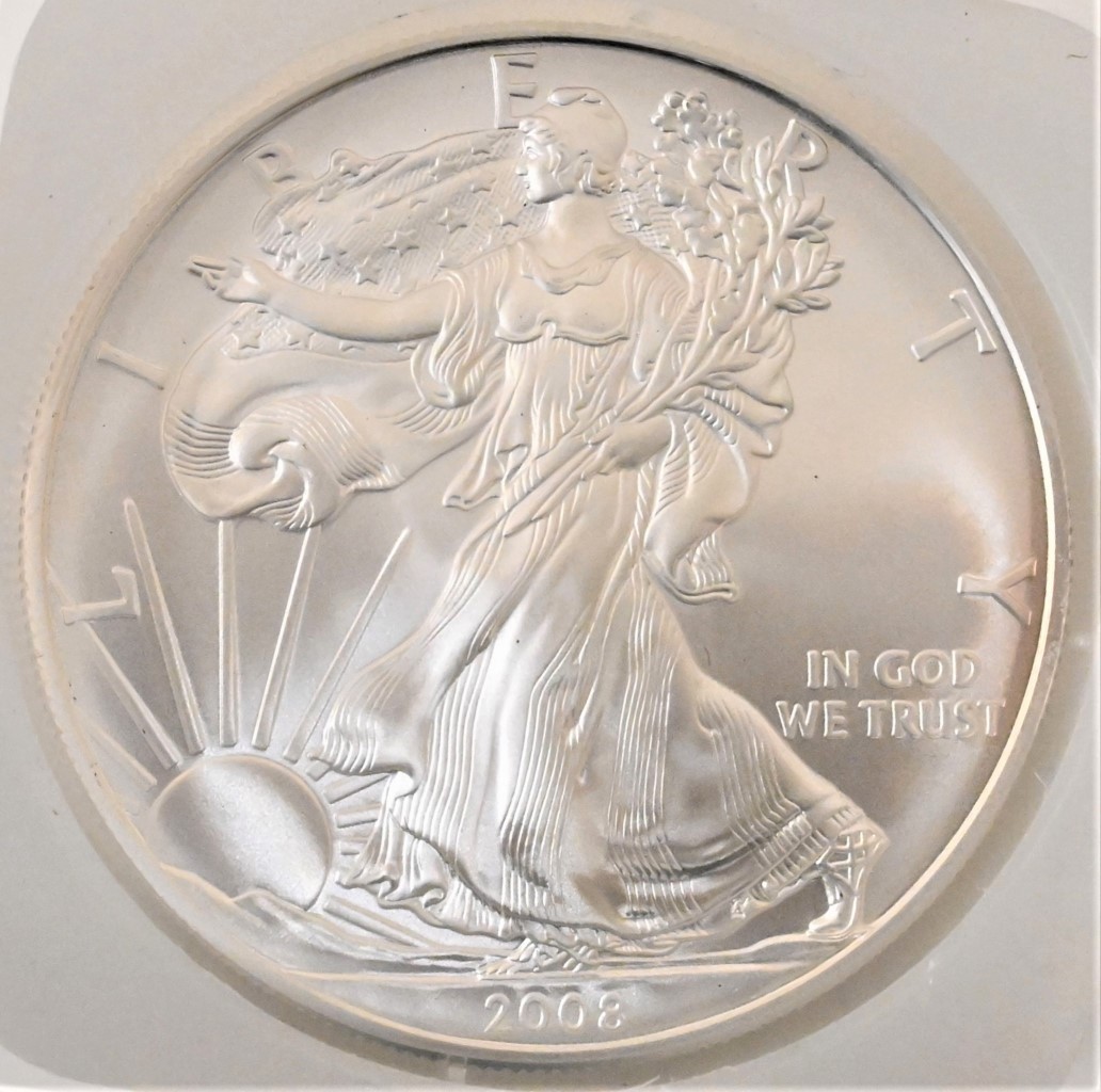 One Roll of 20-2008 1oz Silver American Eagle Dollar Coins BU, composed of 1 troy ounce of .999 silver, in original packaging from the U.S. Mint.