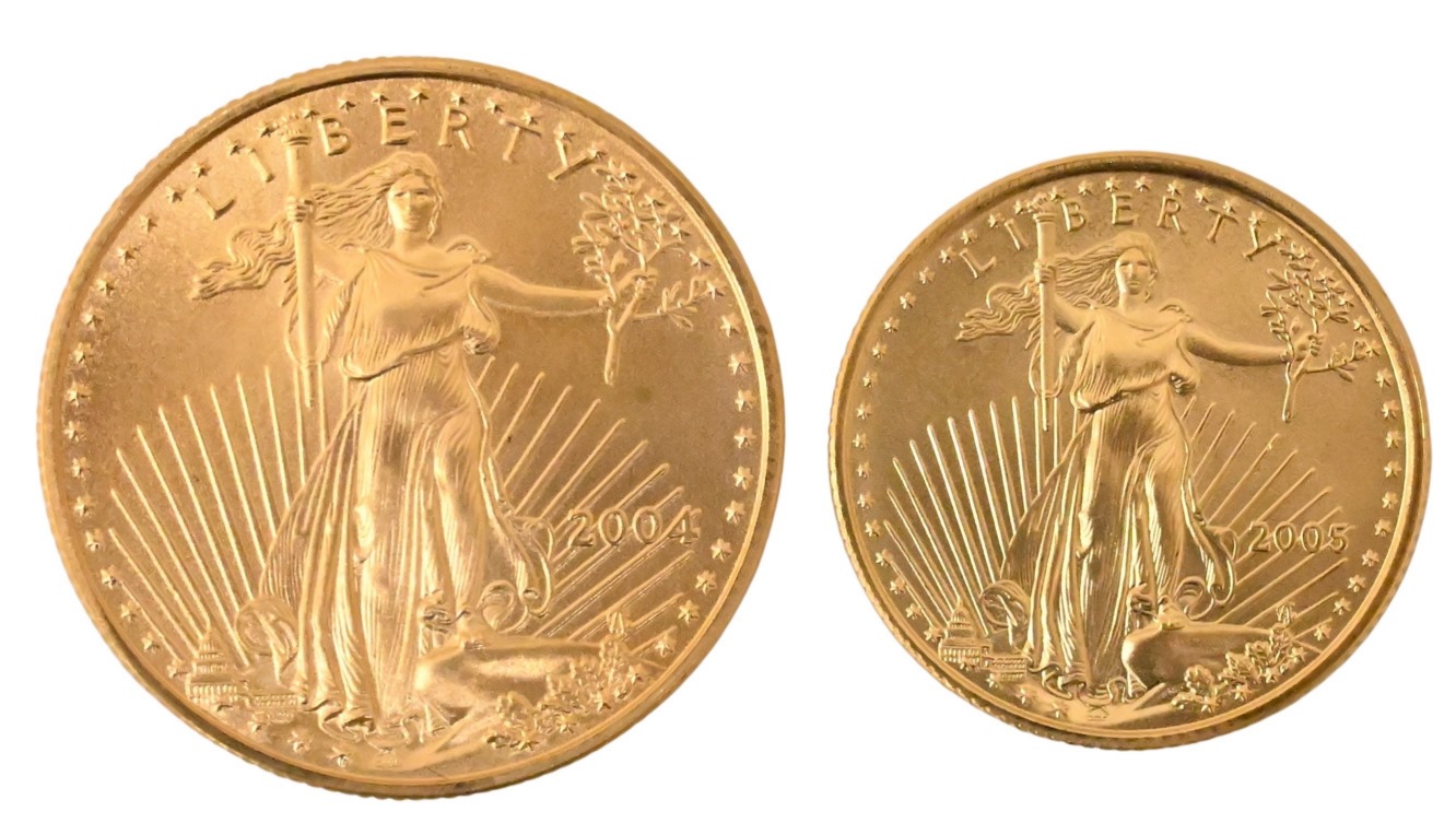 Two Gold Eagles, to include 2004 $25 gold Eagle ½ Ounce and one 2005 $10 Eagle ¼ ounce, both are unc, 3/4 oz in total