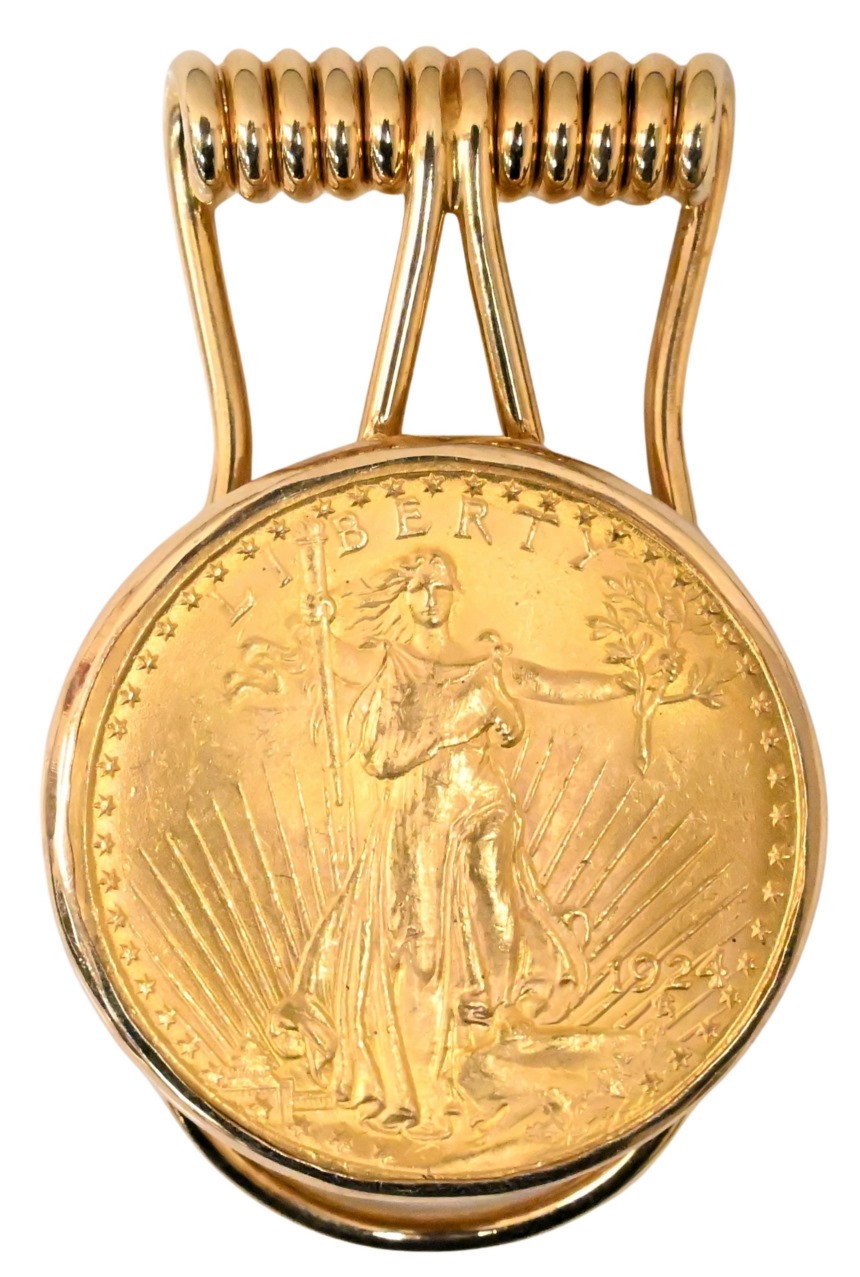 14 Karat Gold Money Clip, with 1924 UNC Saint Gaudens, total weight is 62.6 Grams