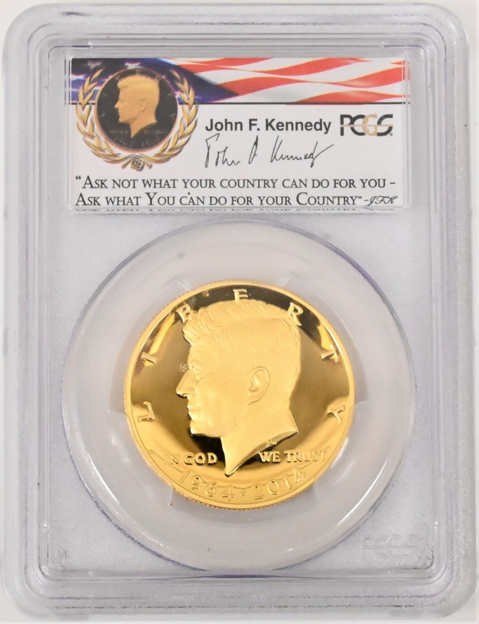 2014-W PCGS Gold Kennedy 50th Anniversary, proof 70 Deep Cameo first day