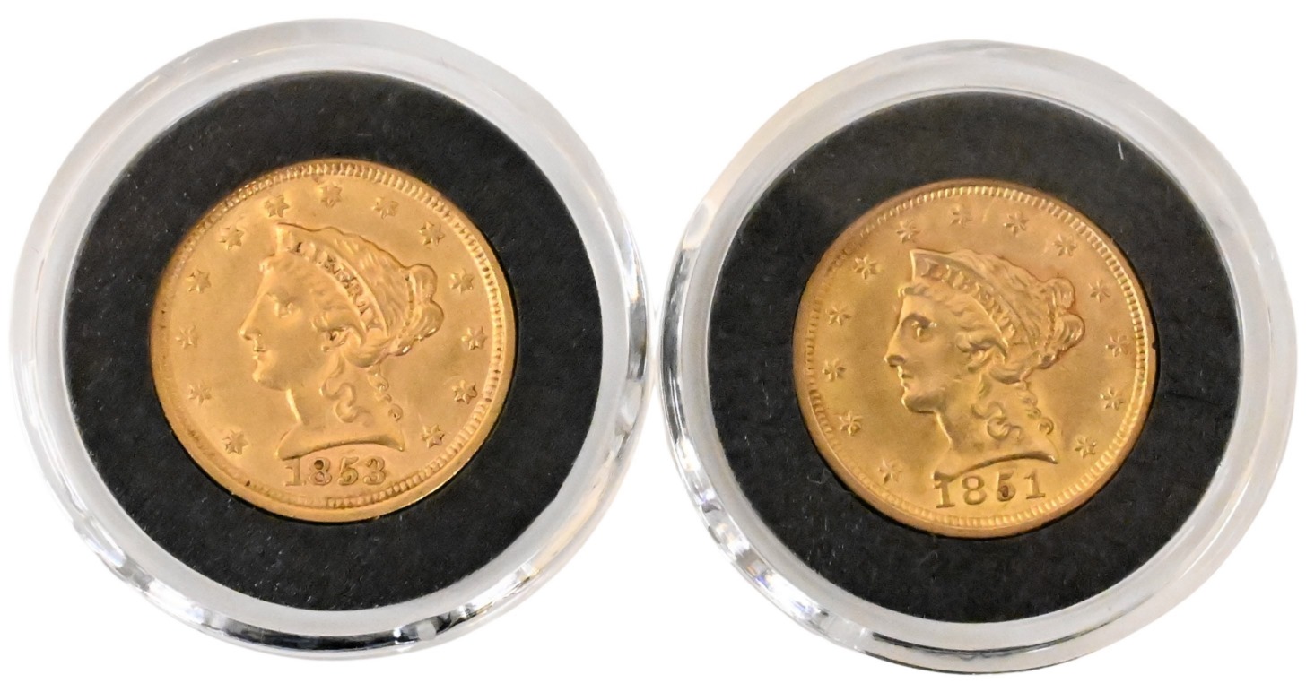 Two Gold AU Liberty Coins, to include 1851 five dollar gold Liberty AU, 1853 2 ½ Liberty gold XF