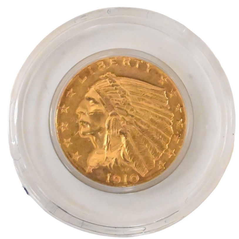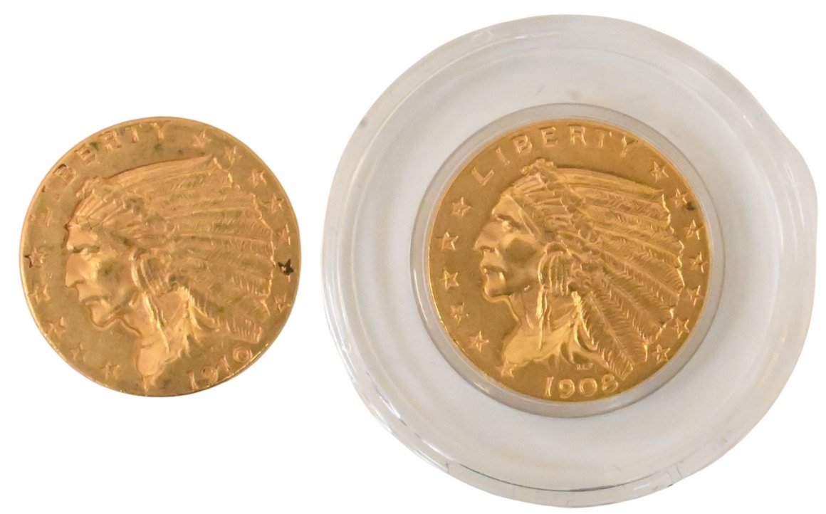 Two Gold Indian Coins, to include 1908 2 ½ dollar Indian AU, along with a 1910 2 ½ Indian AU