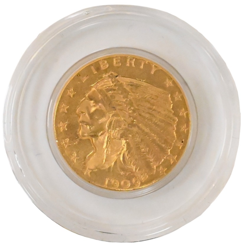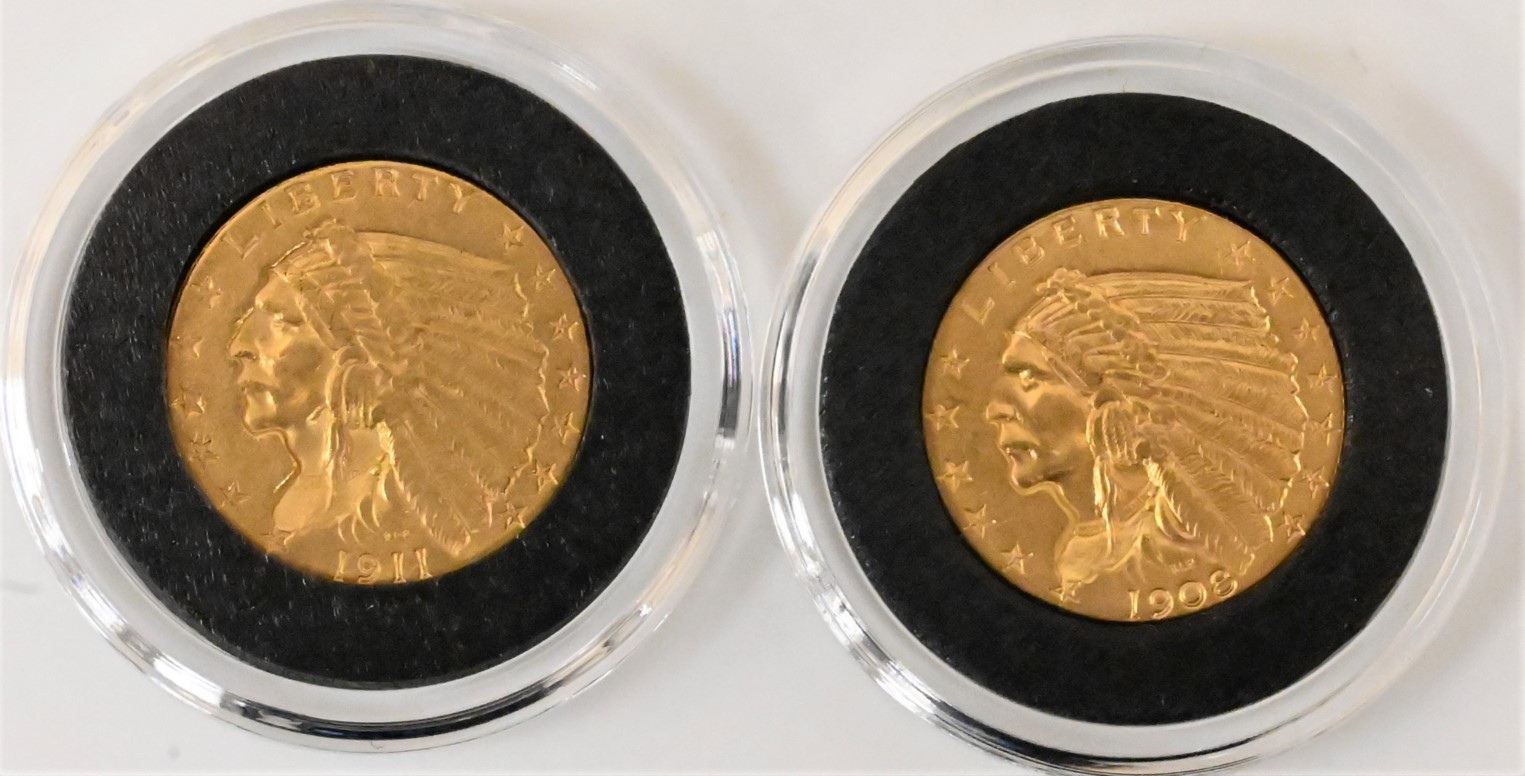 Two 2 1/2 Gold Indian Coins, to include 1908 2 ½ Indian AU, along with a 1911 2 1/2 Gold Indian XF