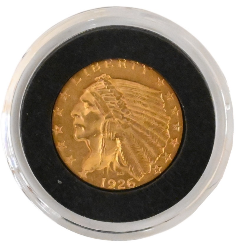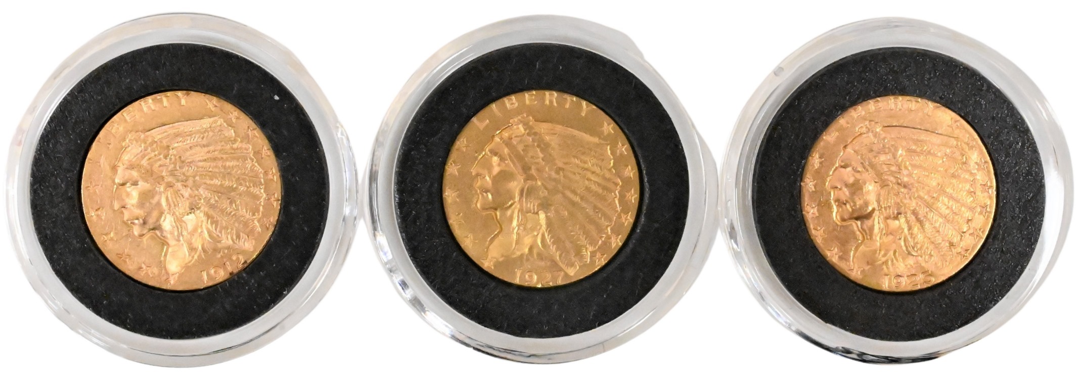 Three 2 1/2 Dollar Gold Coins, to include 1912 2 ½ gold Indian AU, 1925-D 2 ½ gold Indian unc, 1927 2 ½ gold Indian AU