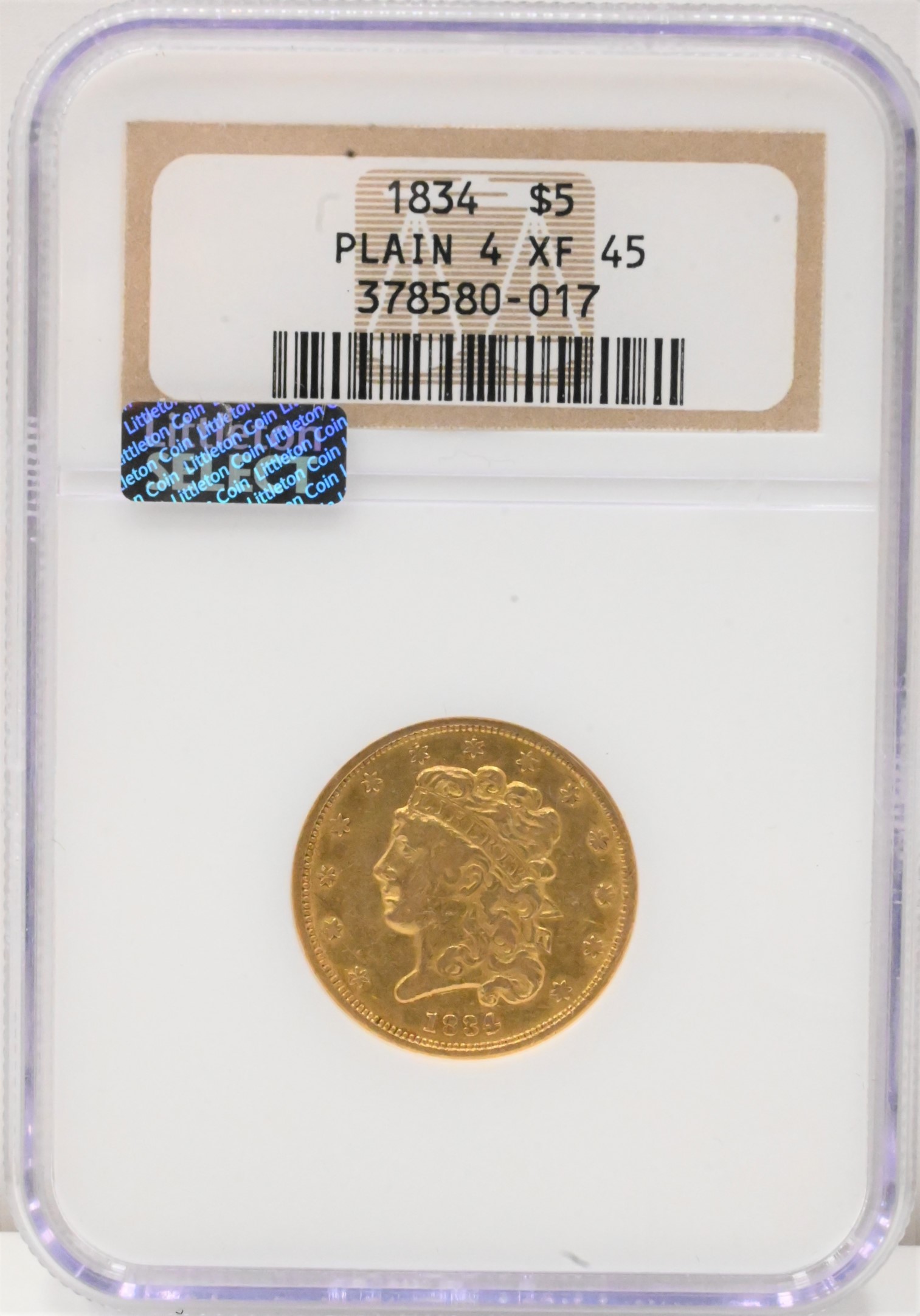 1834 NGC XF45 Five Gold Liberty Plain Four