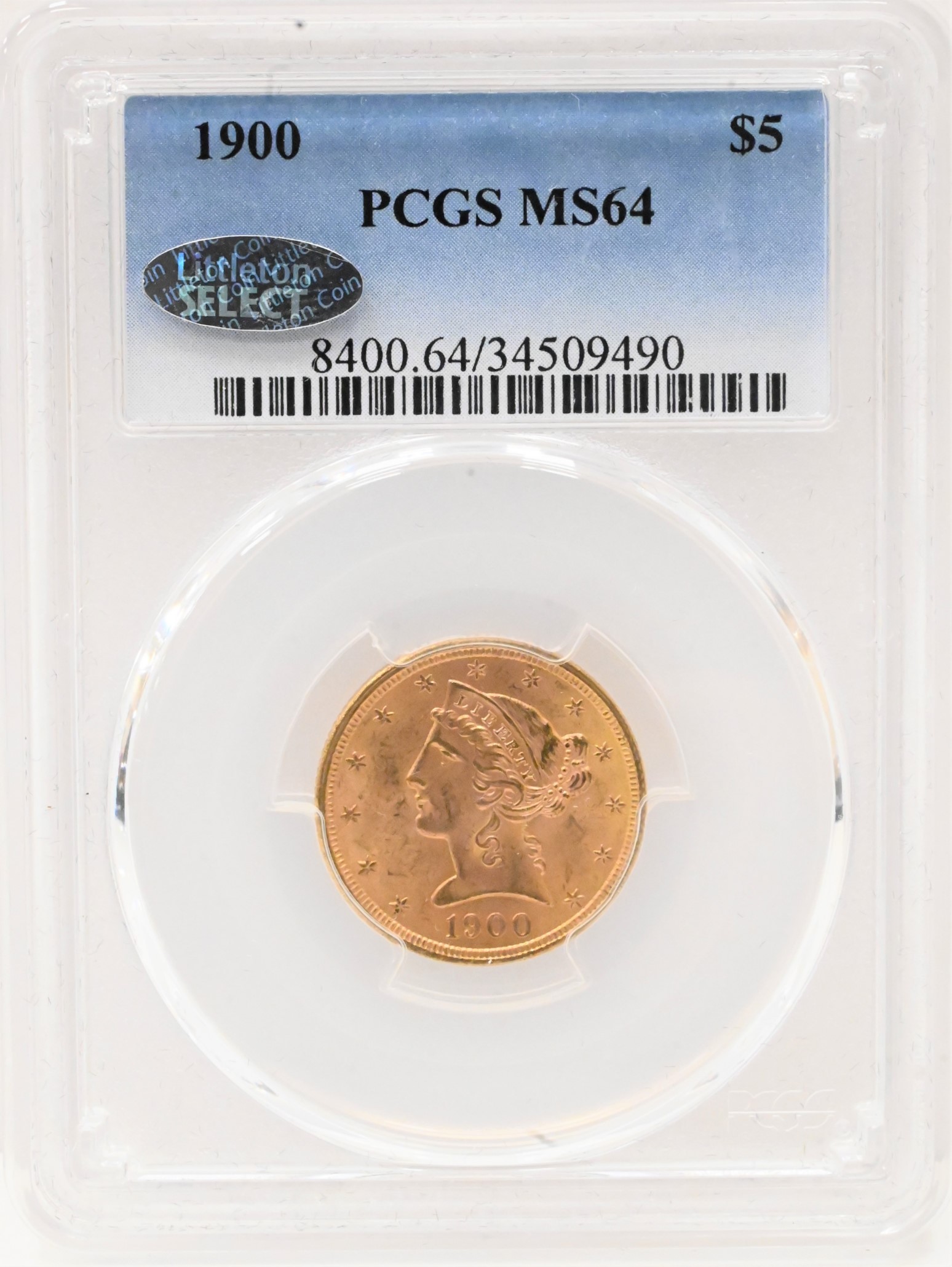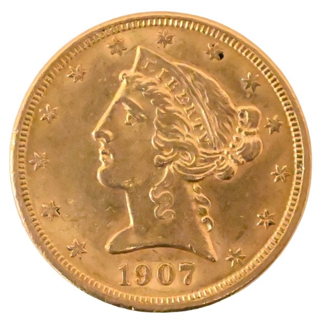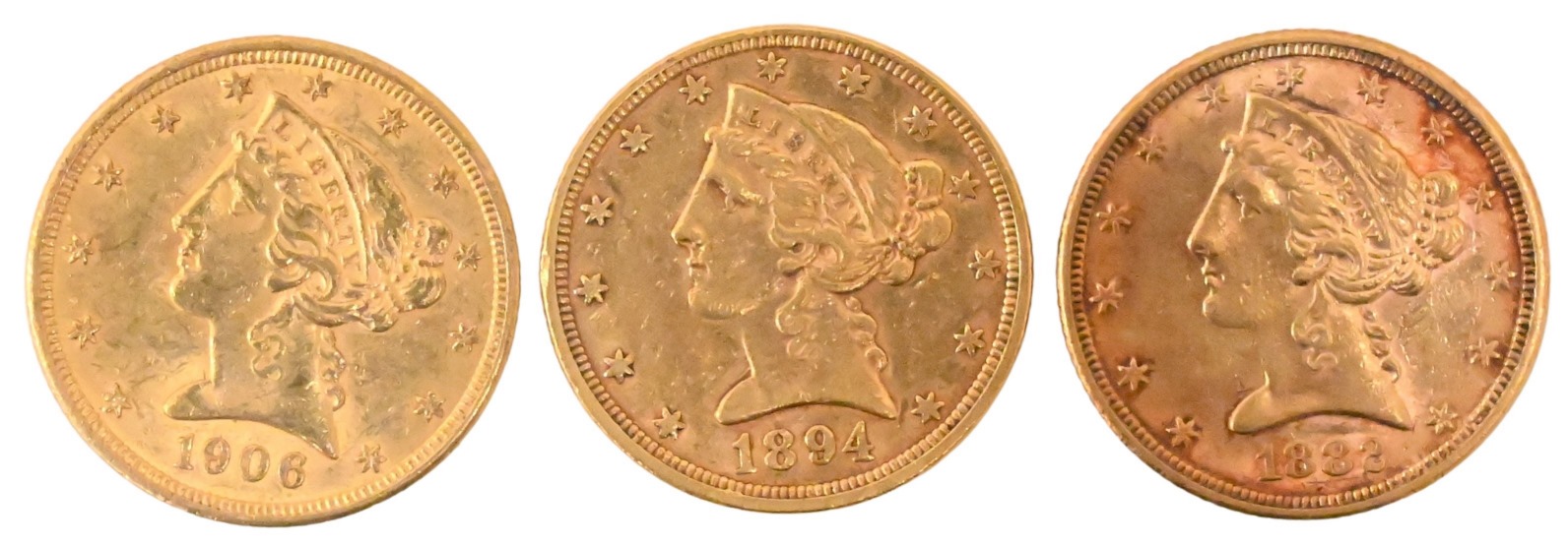 Three Five Dollar Gold Coins, 1882 Five Dollar Gold Liberty XF, 1894 five dollar gold Liberty XF, 1906 five dollar gold Liberty AU