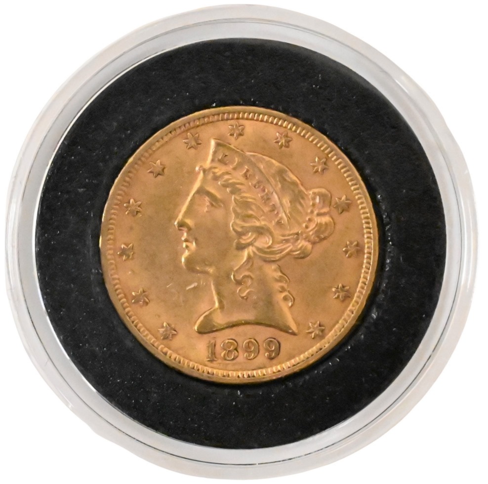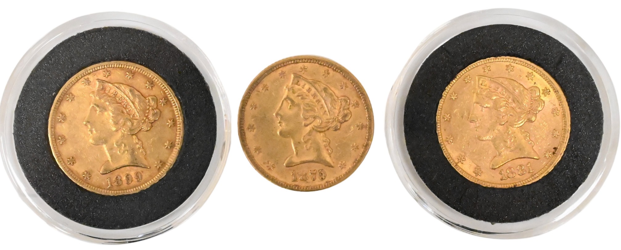 Three Five Dollar Gold Liberty Coins, to include 1899-S five dollar gold Liberty XF, 1879 five dollar gold Liberty AU, 1881 five dollar gold Liberty AU