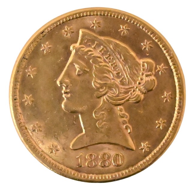 Two Five Dollar Gold Coins, to include 1880-S five dollar gold Liberty AU, along with a 1897 five dollar gold Liberty XF