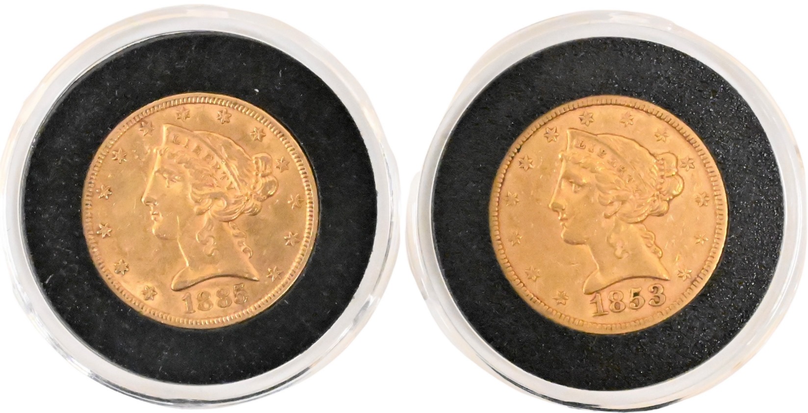 Two Five Dollar Gold Liberty Coins, to include 1853 five dollar gold Liberty XF, 1885-S five dollar gold Liberty XF