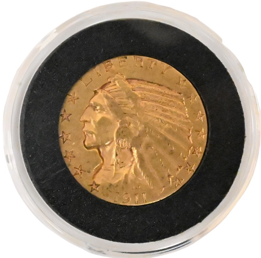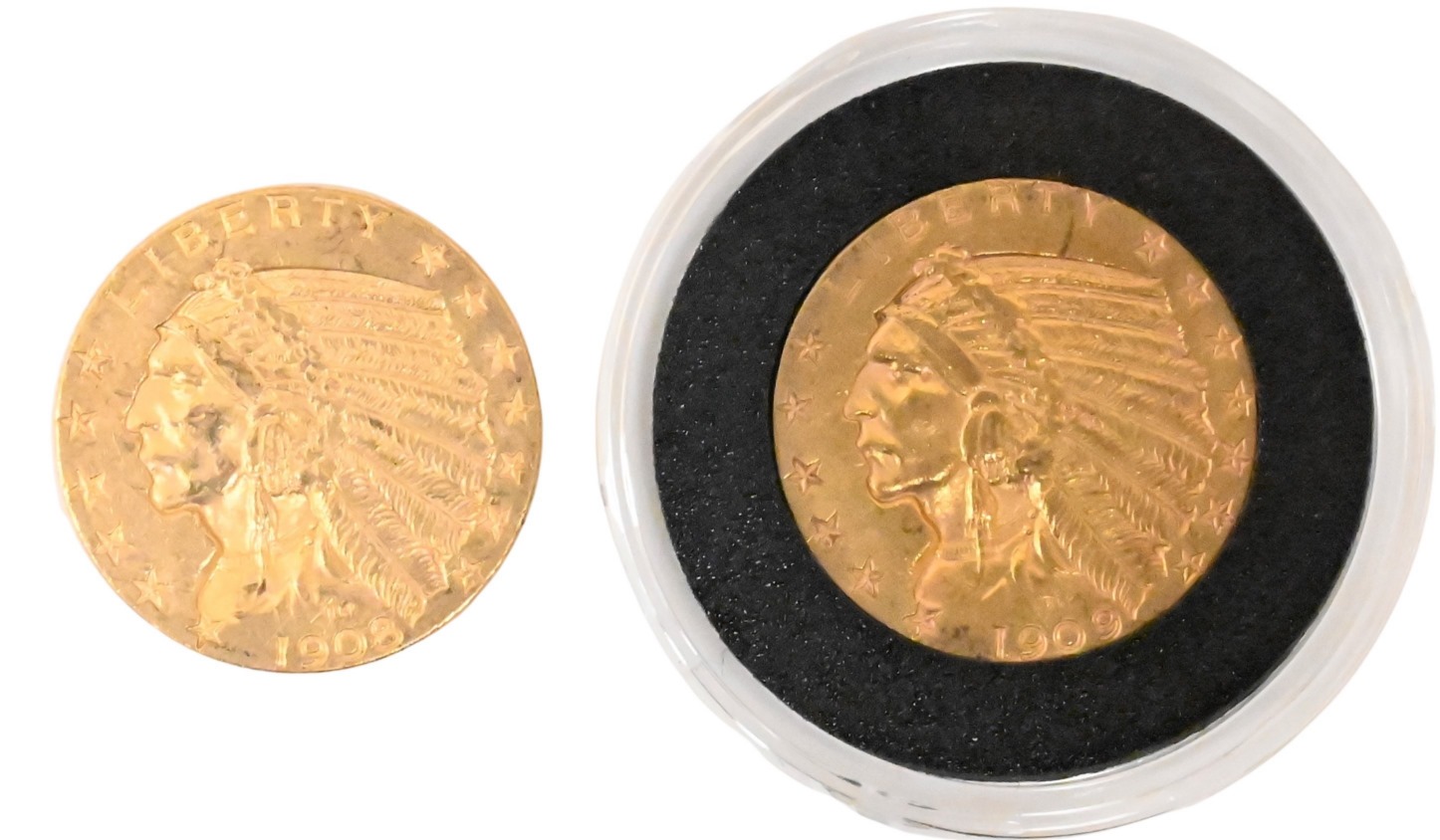 Two Five Dollar Gold Coins, to include 1908 and 1909 Five Dollar Indian AU