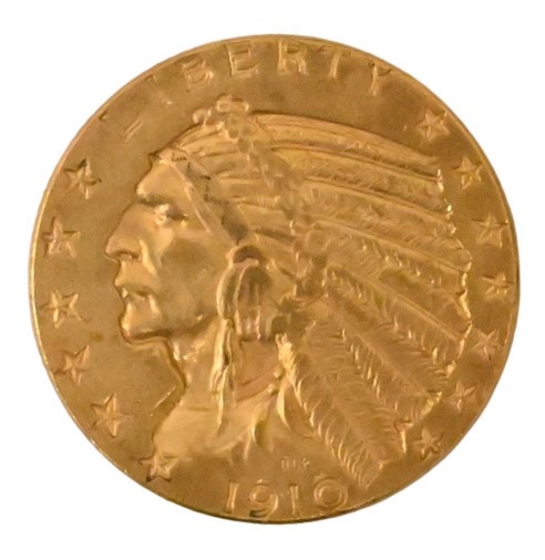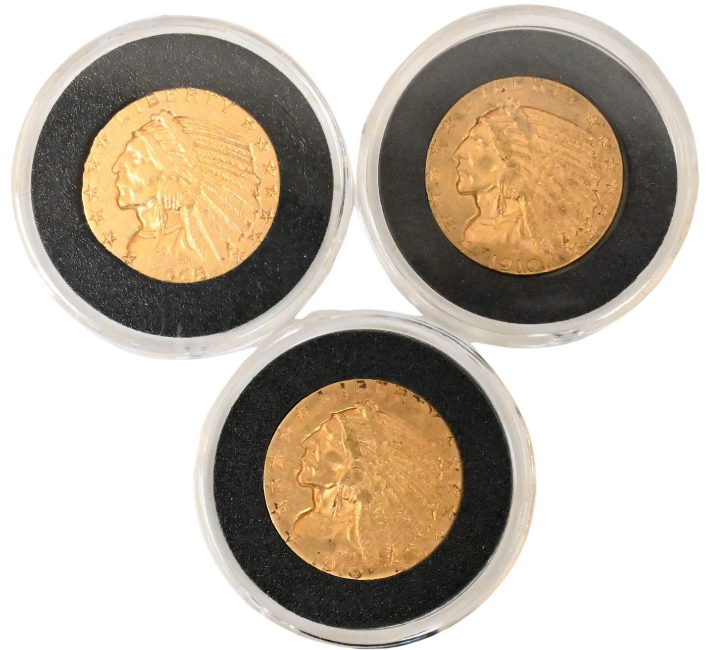Three Five Dollar Gold Indian Coins, to include 1910-D five gold dollar Indian AU, 1910 five dollar gold Indian AU, 1908 five dollar gold Indian XF