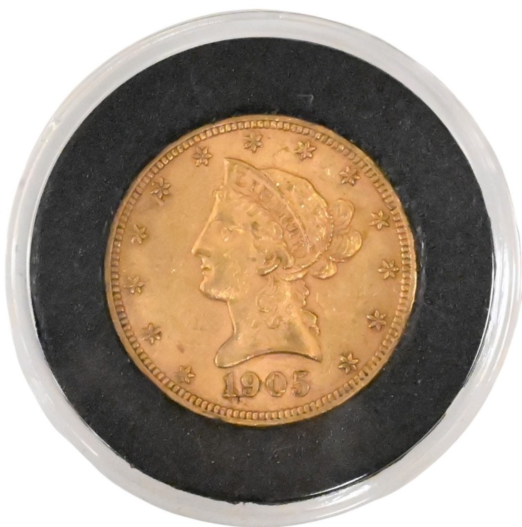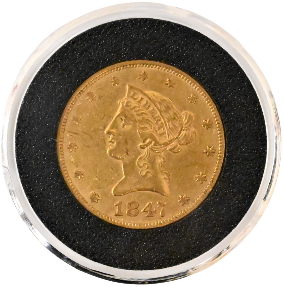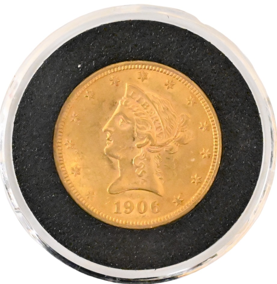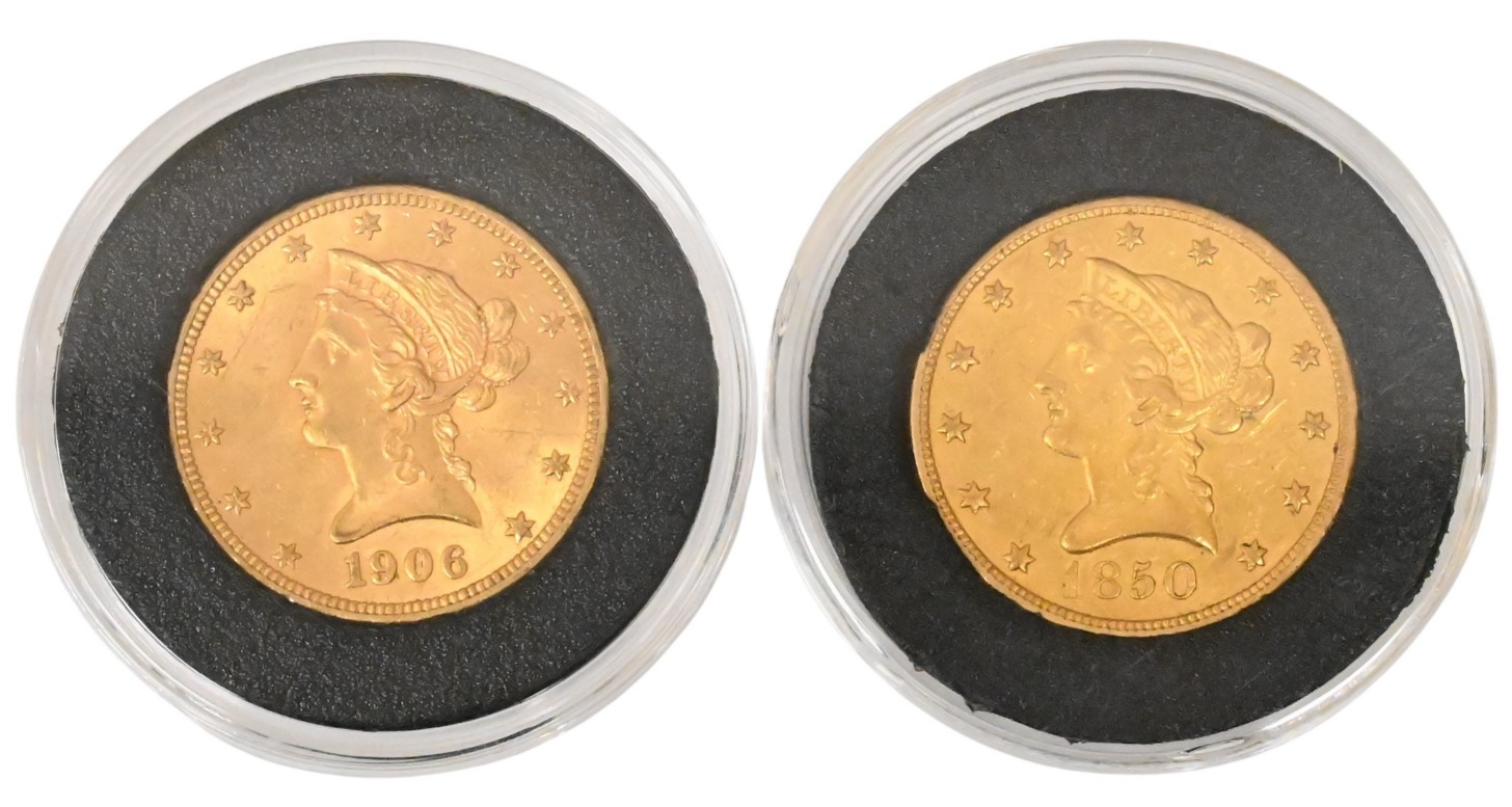 Two Ten Dollar Gold Liberty Coins, to include 1906 Ten Dollar Liberty AU, along with 1850 Ten Dollar Liberty large date XF
