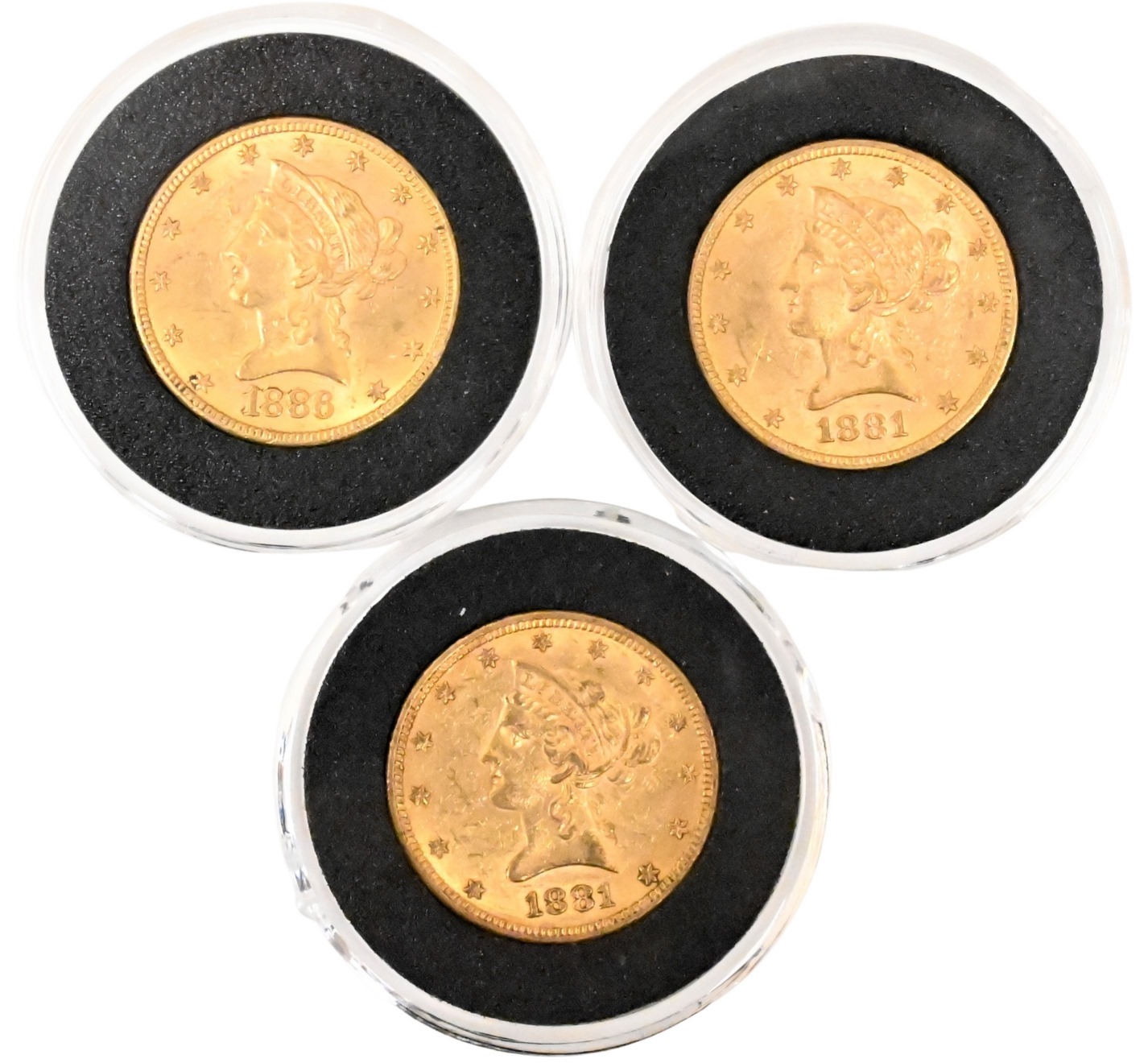 Three Ten Dollar Gold Coins, to include 1886-S Ten Dollar Gold Liberty AU, 1881 ten dollar gold Liberty AU, 1881-S ten dollar gold Liberty AU