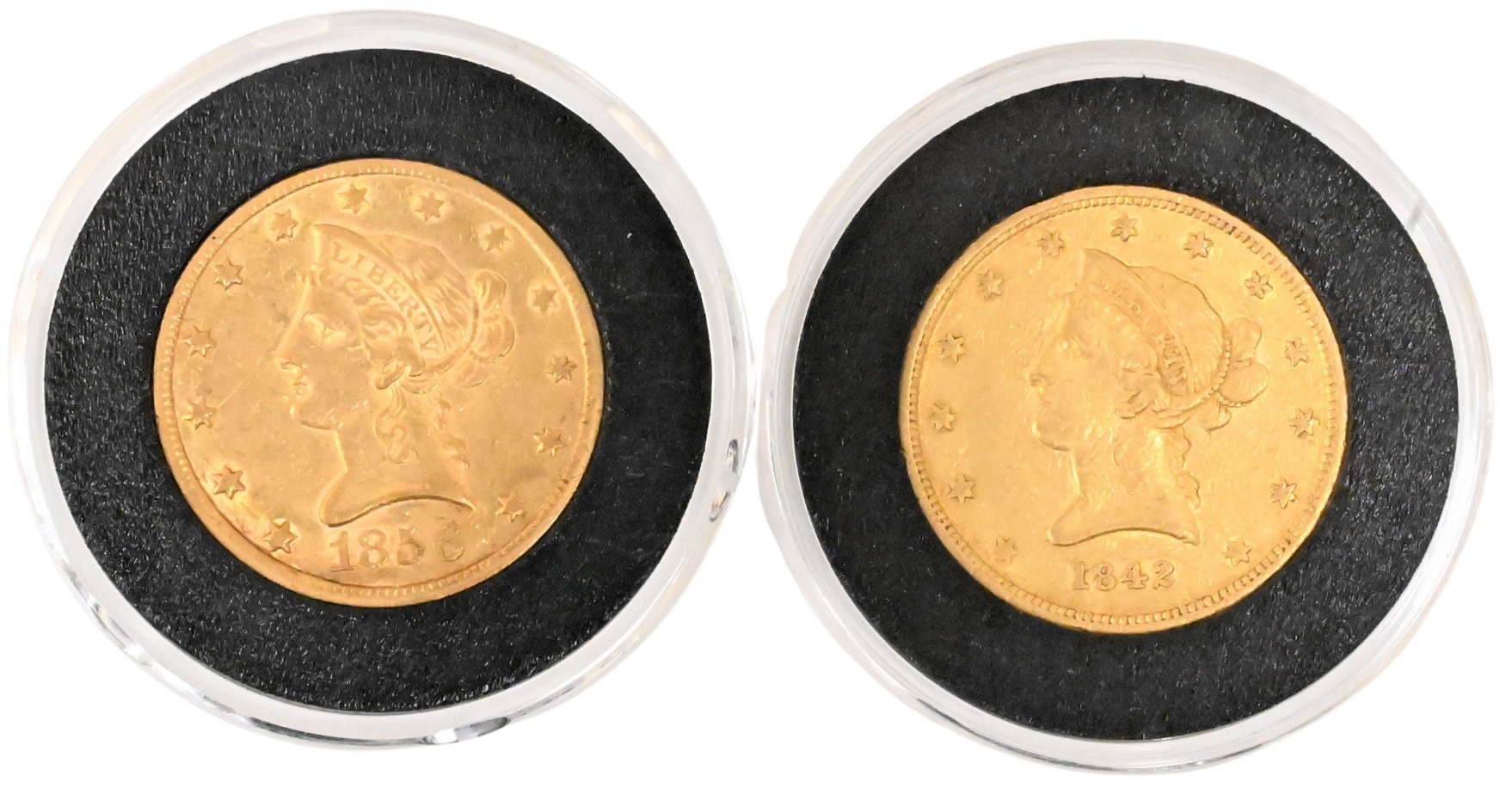 Two Ten Dollar Gold Coins, to include 1856 ten dollar gold Liberty XF, along with 1842 ten dollar gold Liberty small date VF