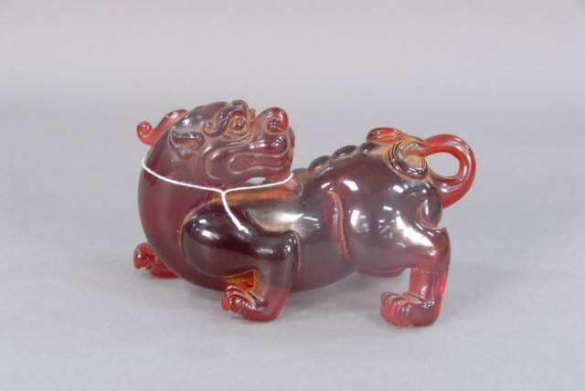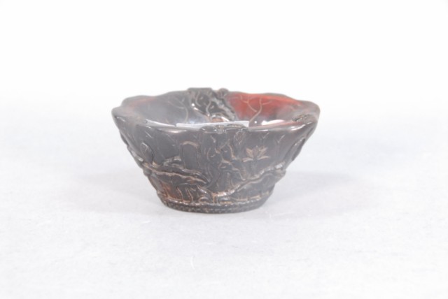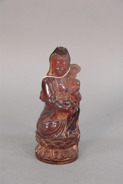 Carved amber Buddha brush pot having one side carved with a Buddha and 2 children on each side along with a carved figure of a seated GuanYin holding a scroll