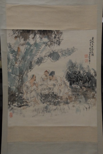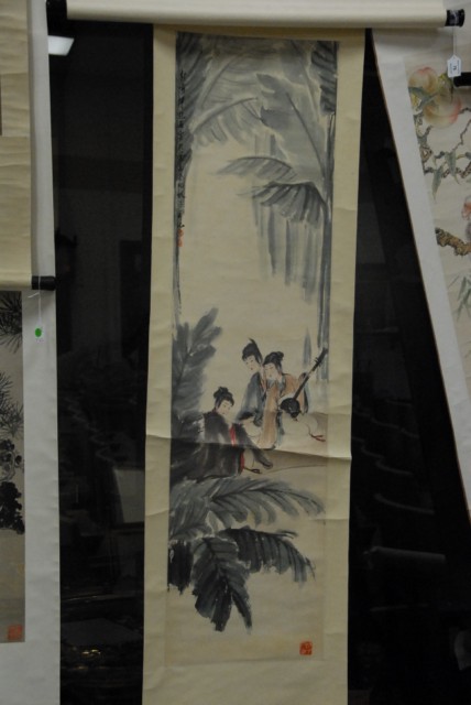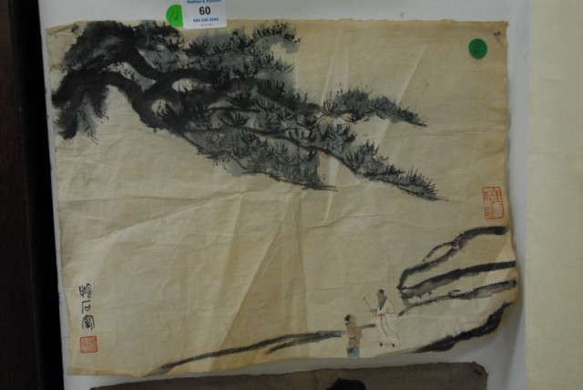 Group of 3 watercolor on tissue pape, 2 landscapes with scholars and one of two girls with scholar