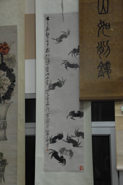 Oriental black and white scroll of characters and crabs, artist Qi Bai Shi