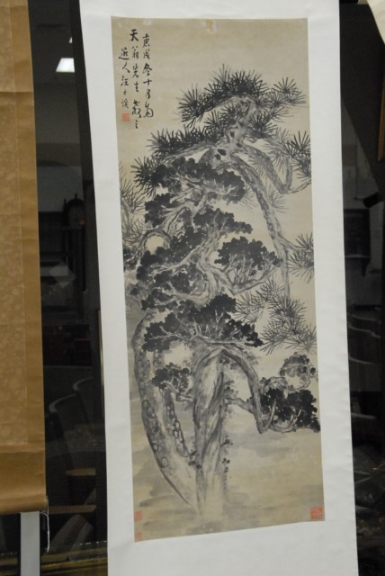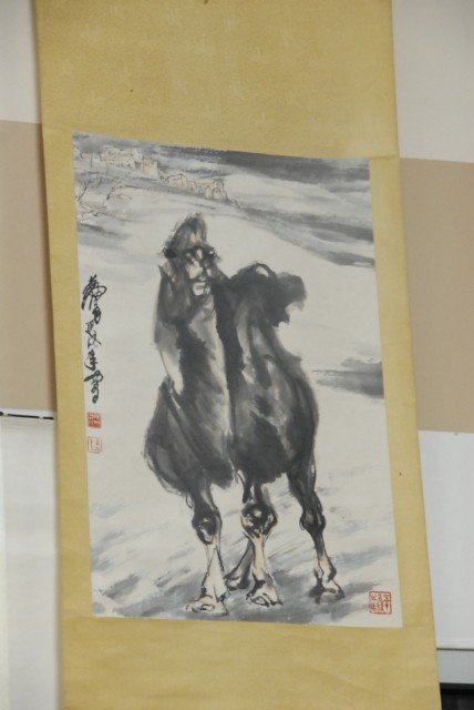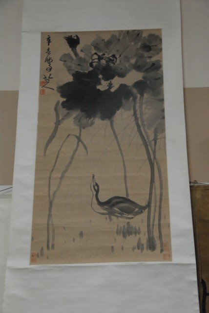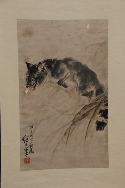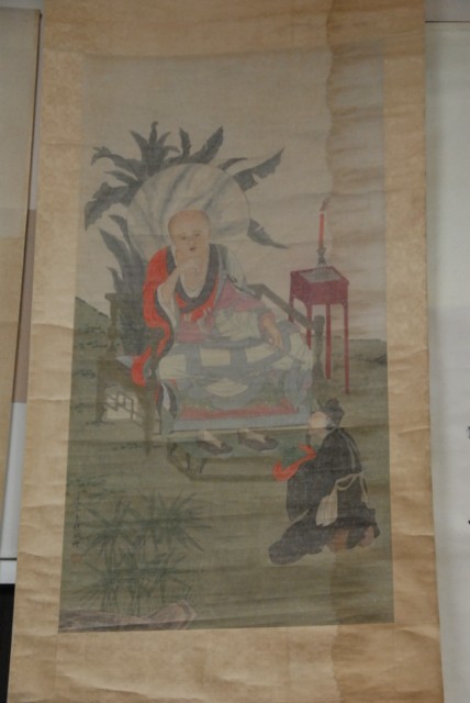 Oriental scroll of a Buddha sitting minor water damage down one side