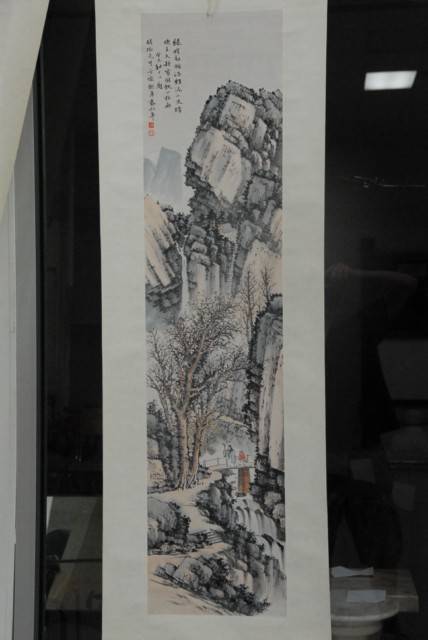Oriental scroll of mountainous landscape with 2 men crossing a bridge