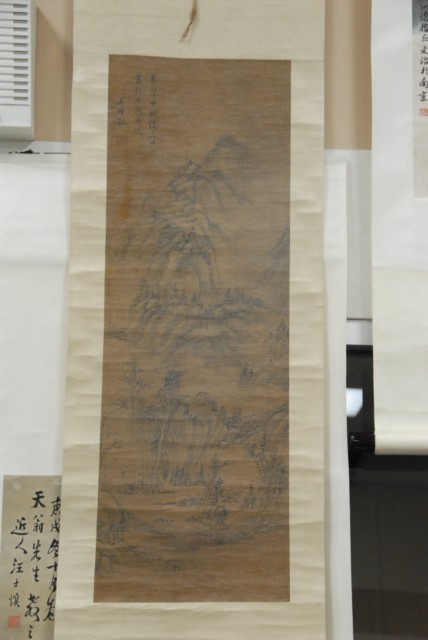 Oriental black and tan scroll watercolor on silk of mountainous landscape