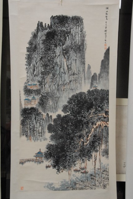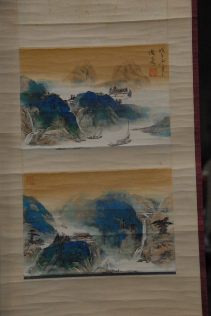 Oriental scroll having 2 panels bright.ly colored landscapes