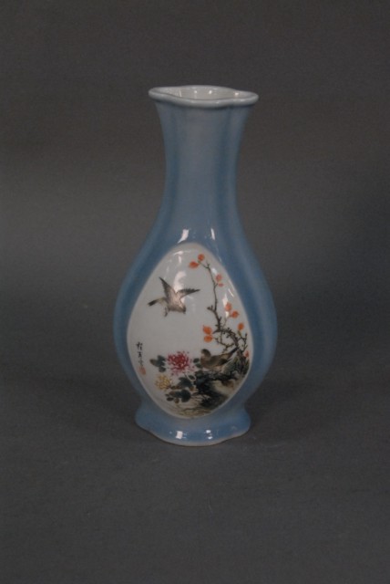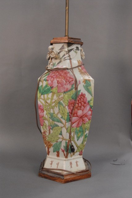 Famille – Rose Hexagon palace vase having large blossoming flowers and birds