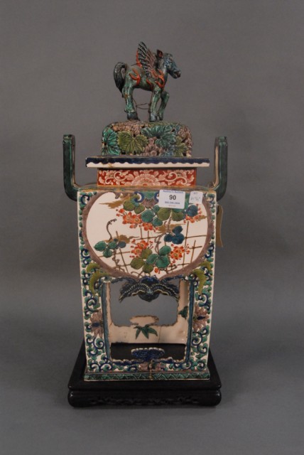 Large porcelain Famille-verte footed censor having winged horse finial on the cover, 2 looped handles mounted onto square body. As is
