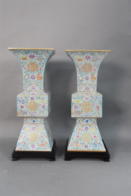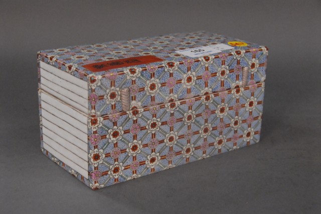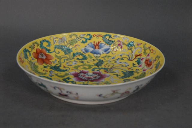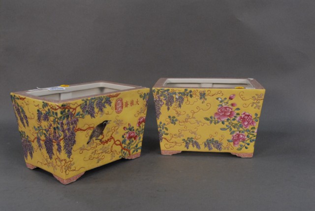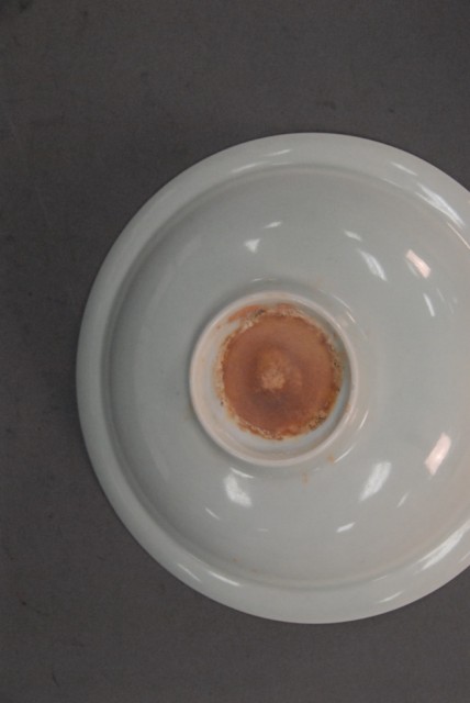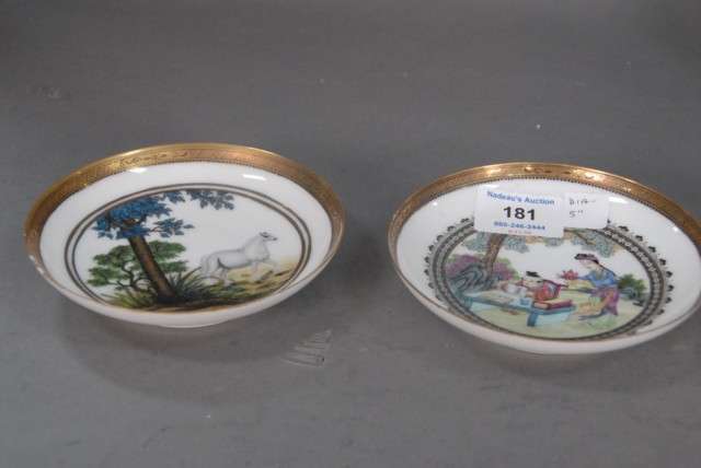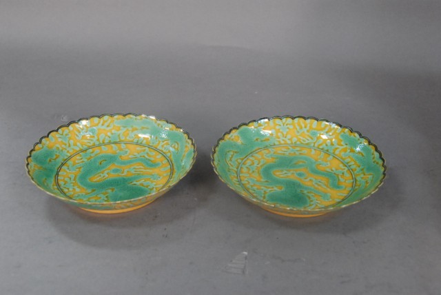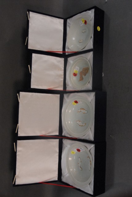 Pair of celadon glazed porcelain fish bowls having 2 molded fish in bottom of the bowl in fitted boxes along with a fish small plate having molded fish in center of plate also with another fish plate with 2 molded fish in center of plate in fitted box