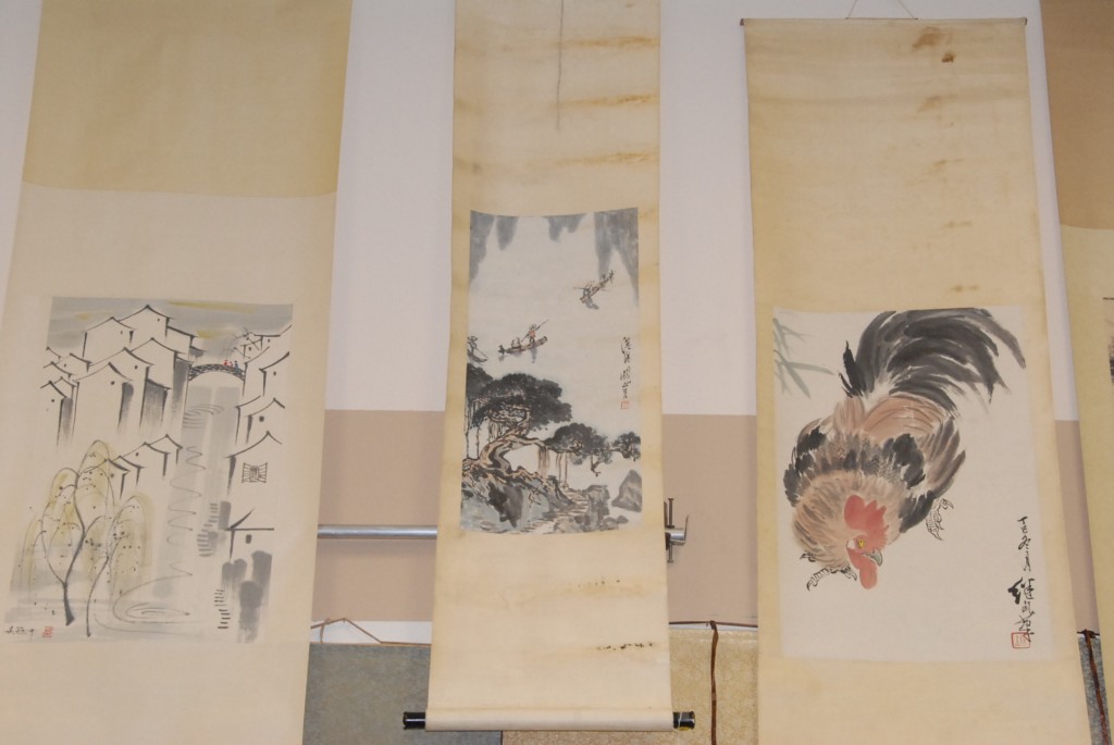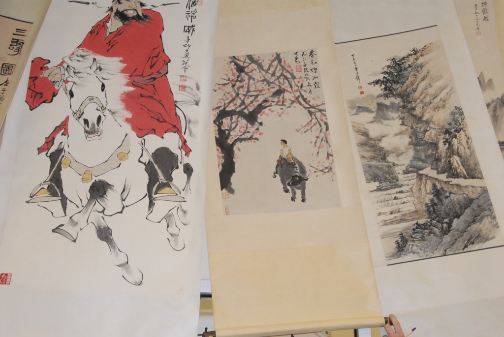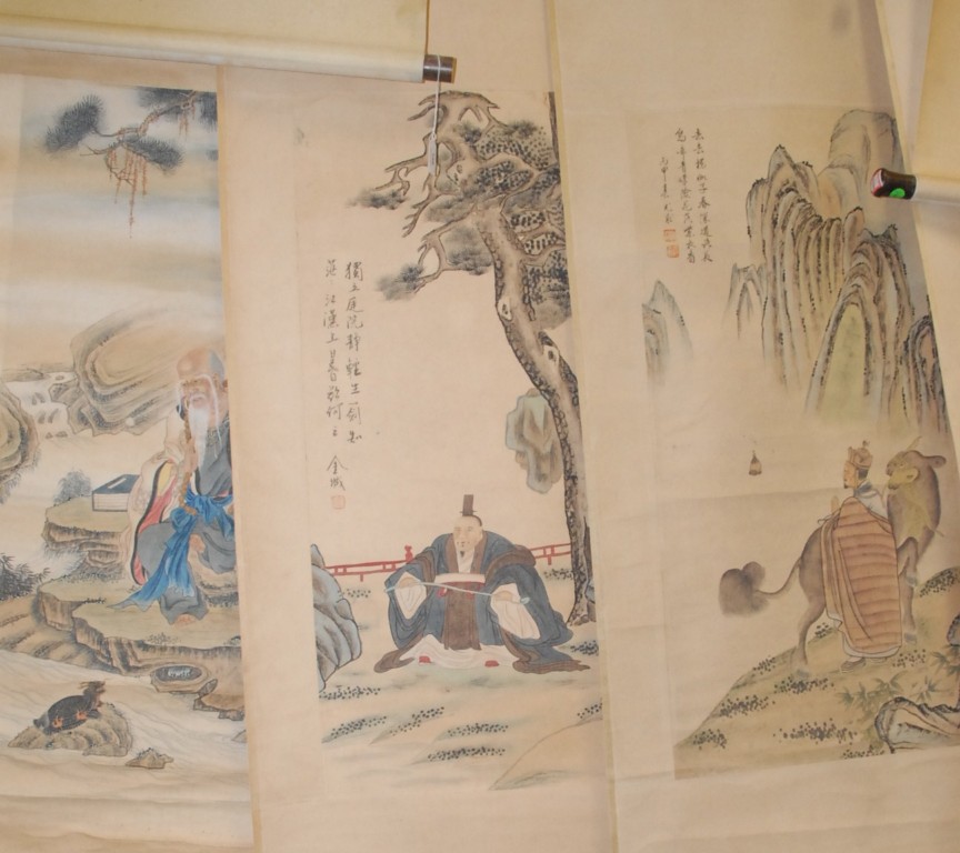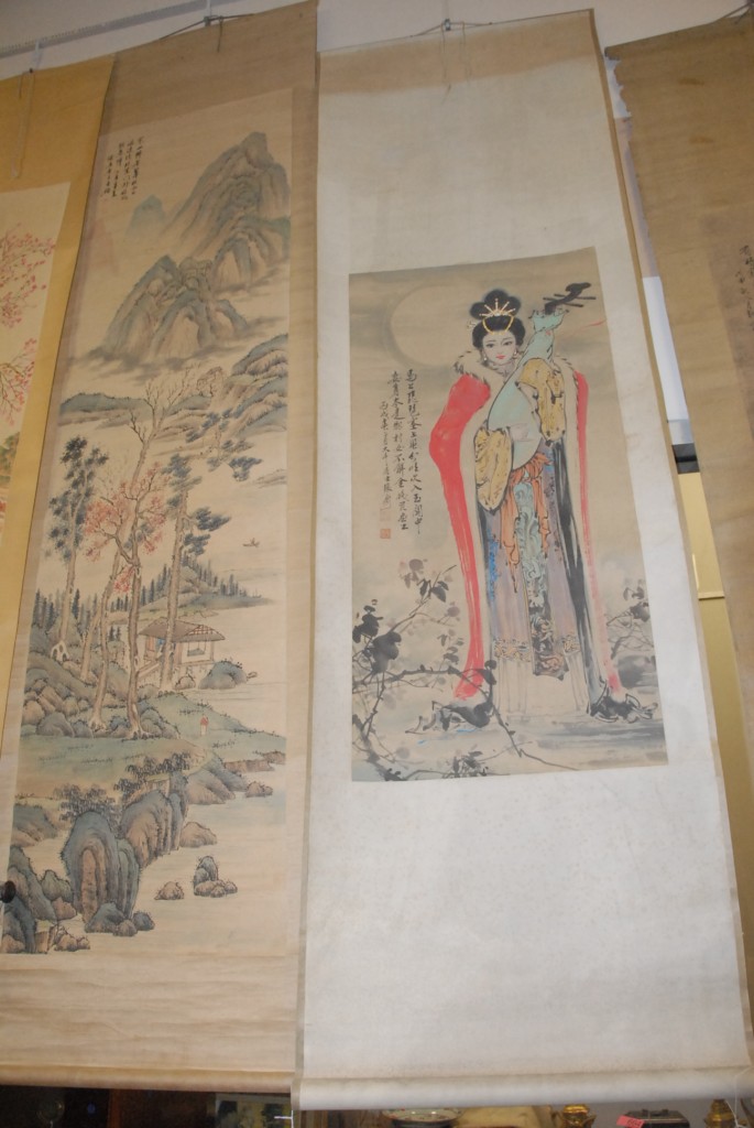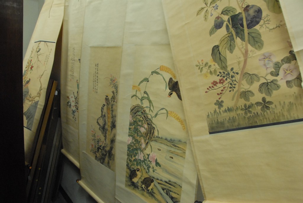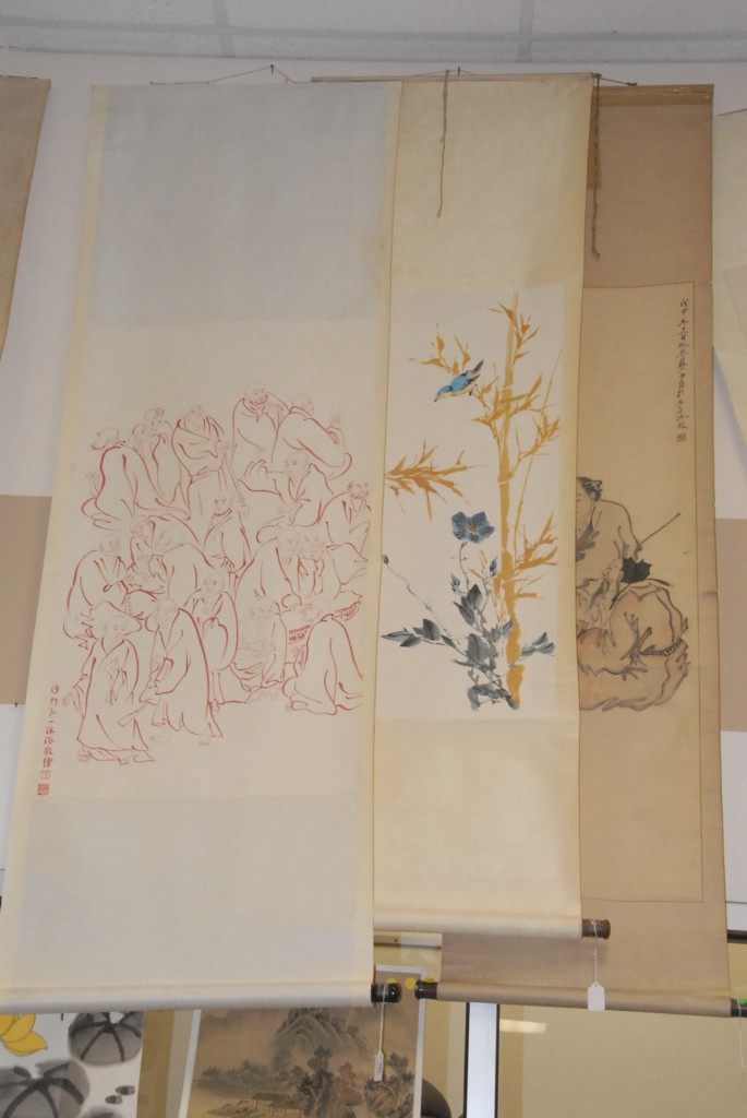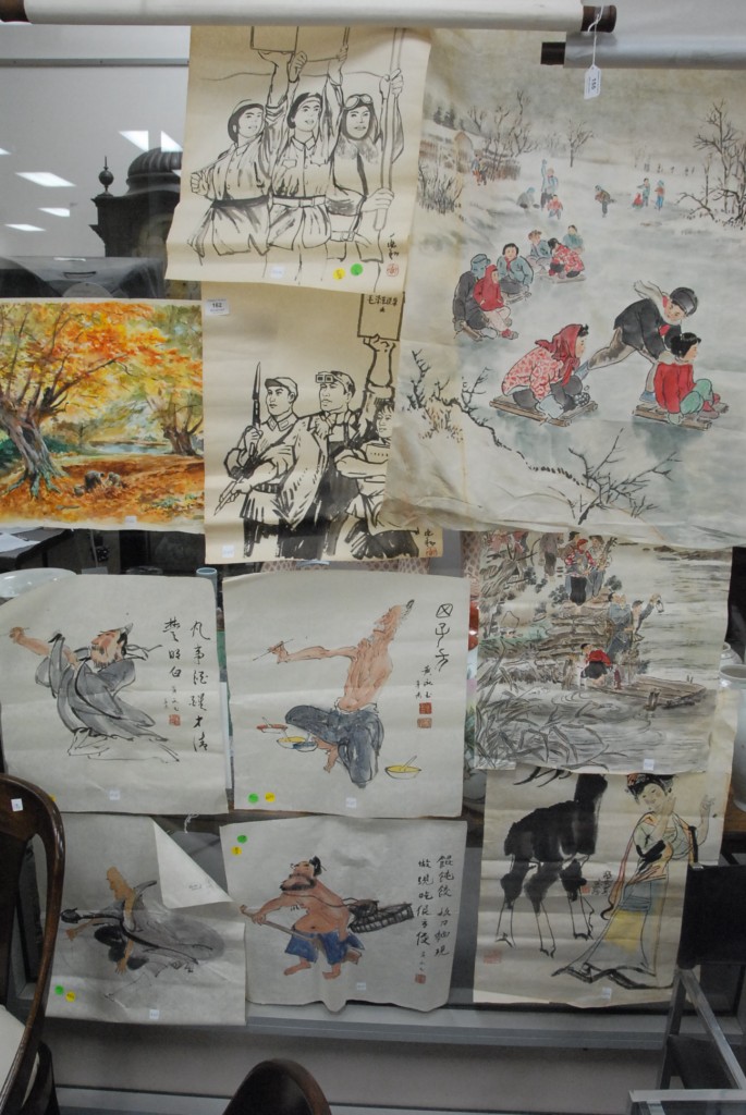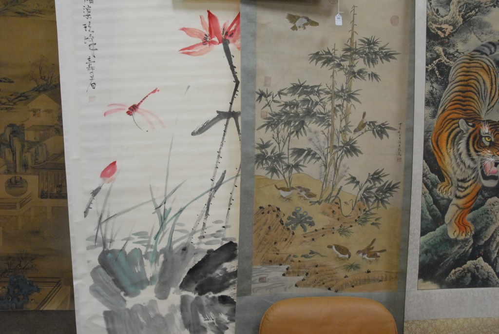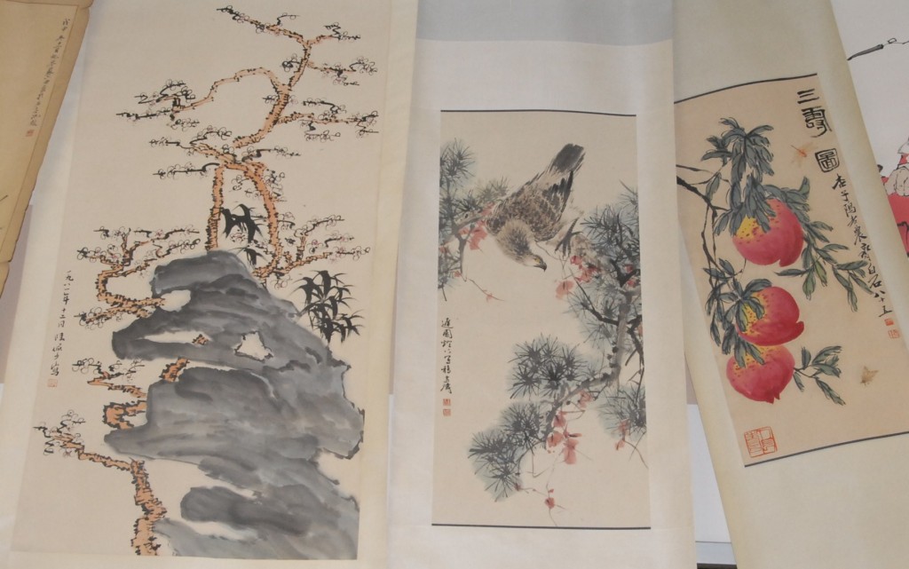 Group of seven watercolors on paper and silk, five are framed, two are not one of figure playing instrument 26 x 17, one of landscape 19 x 13, landscape with water buffalo 26 x 14, abstract 11 x 19, monkey playing with man sleeping 27 x 18, duck 27 x 13, and watercolor on silk of duck 31 x 15.