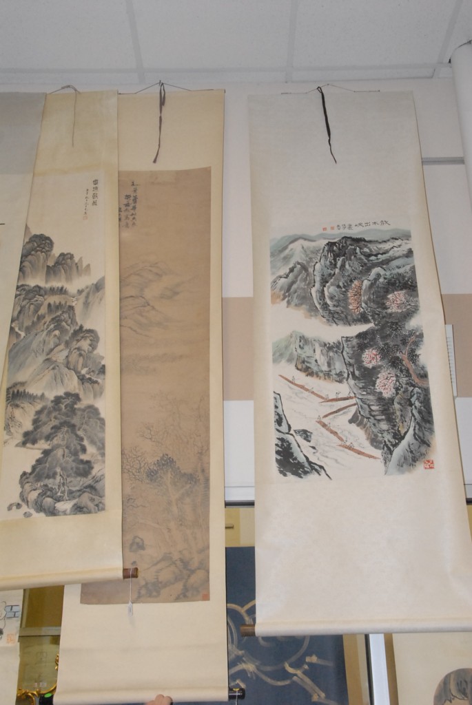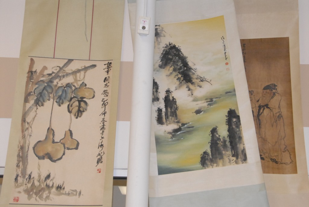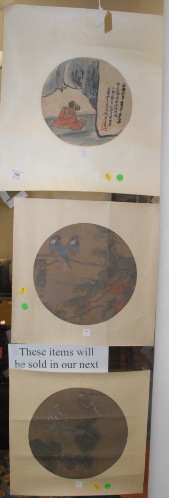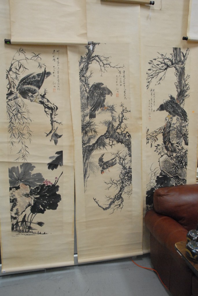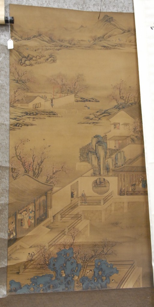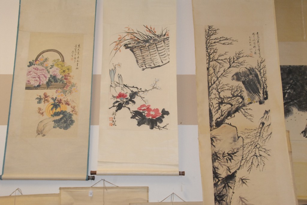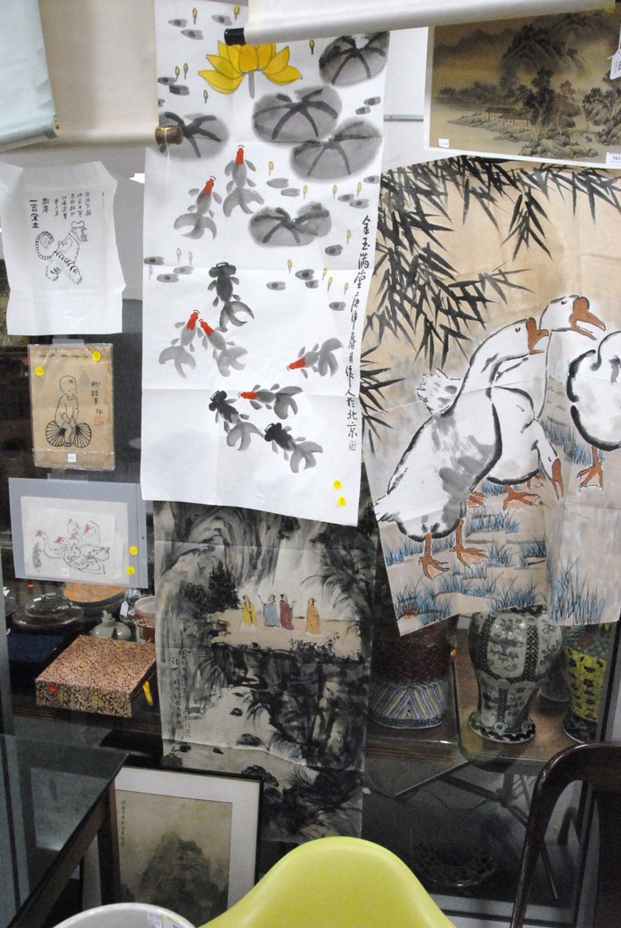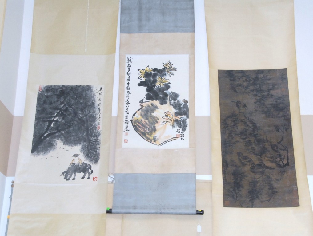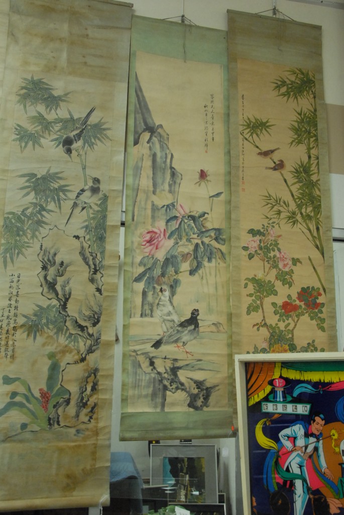 Group of seven watercolors on paper and silk, five are framed, two are not one of figure playing instrument 26 x 17, one of landscape 19 x 13, landscape with water buffalo 26 x 14, abstract 11 x 19, monkey playing with man sleeping 27 x 18, duck 27 x 13, and watercolor on silk of duck 31 x 15.