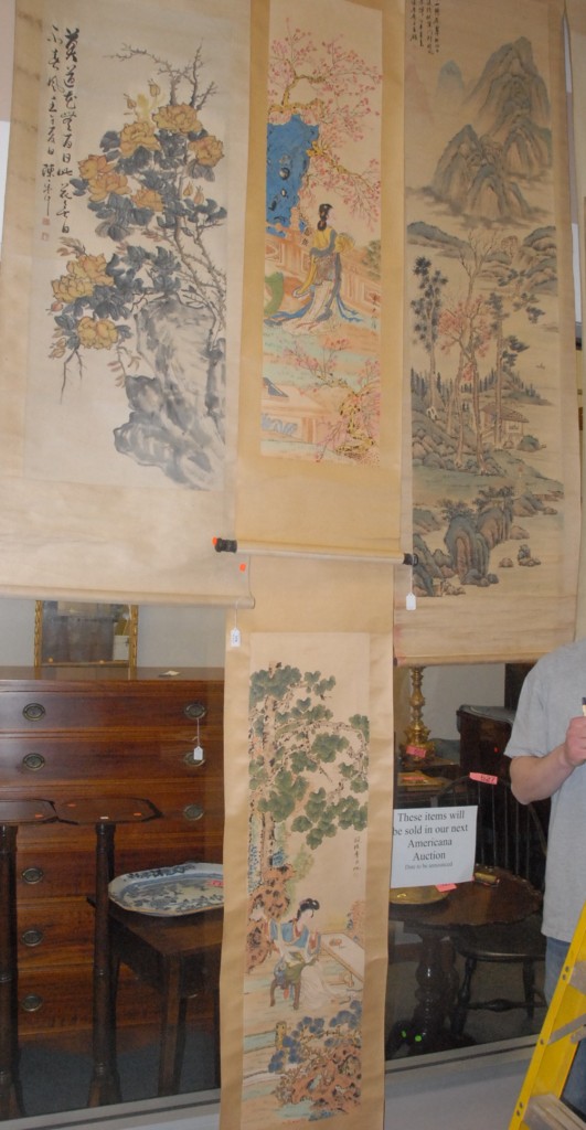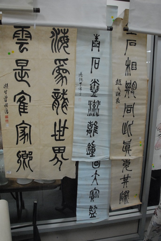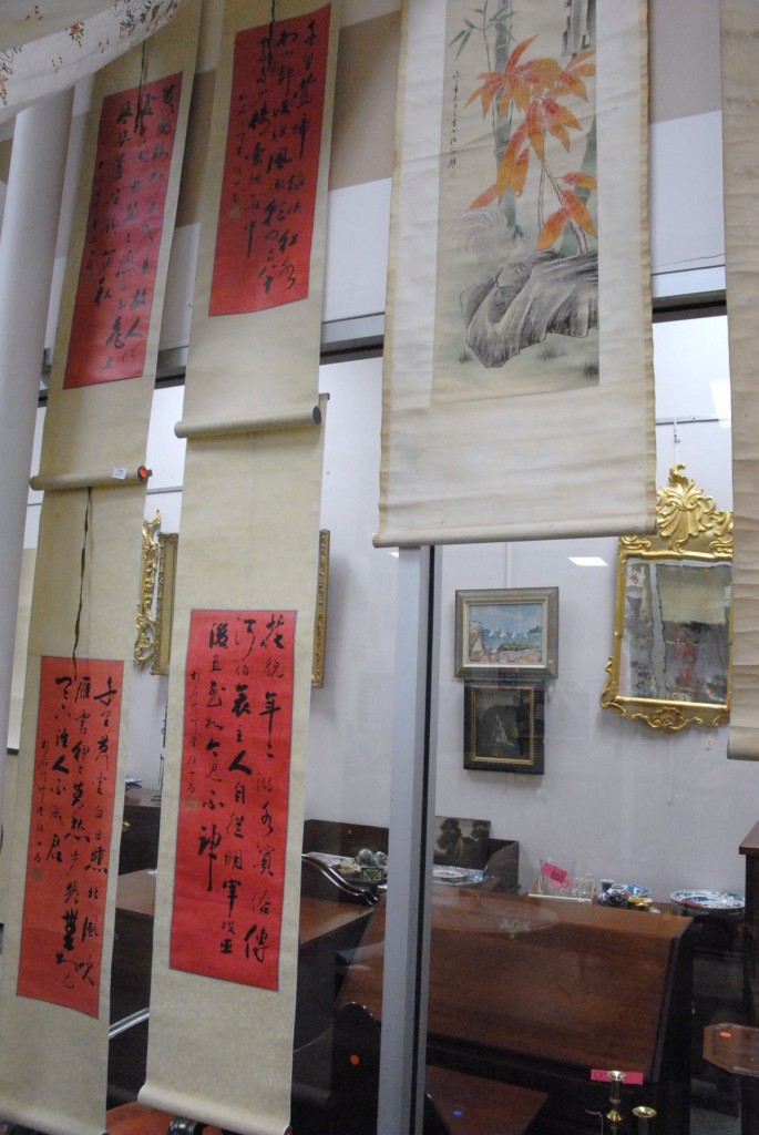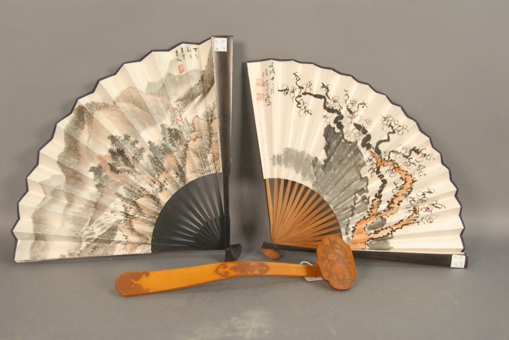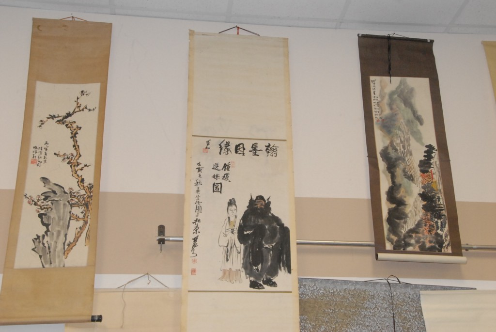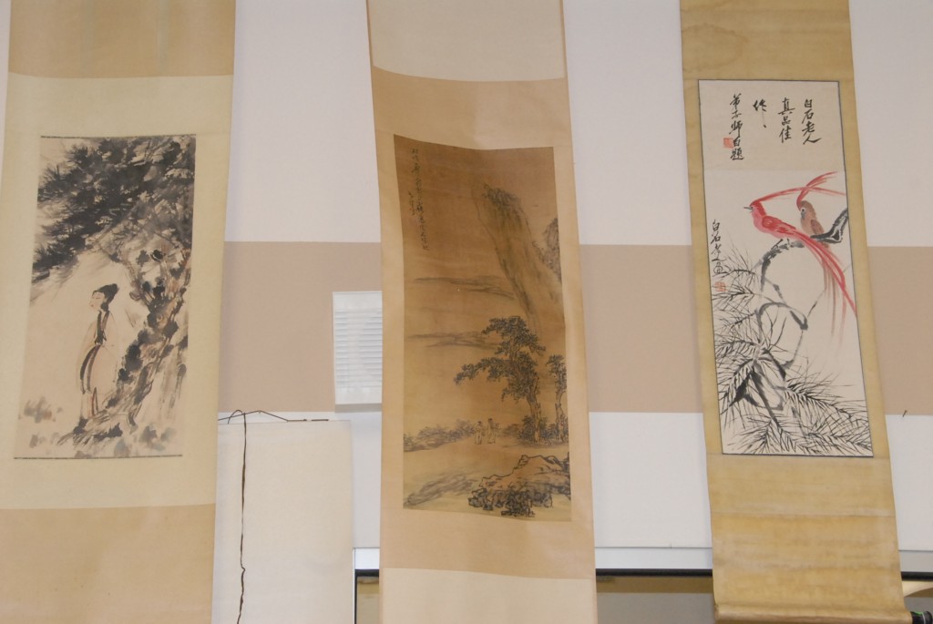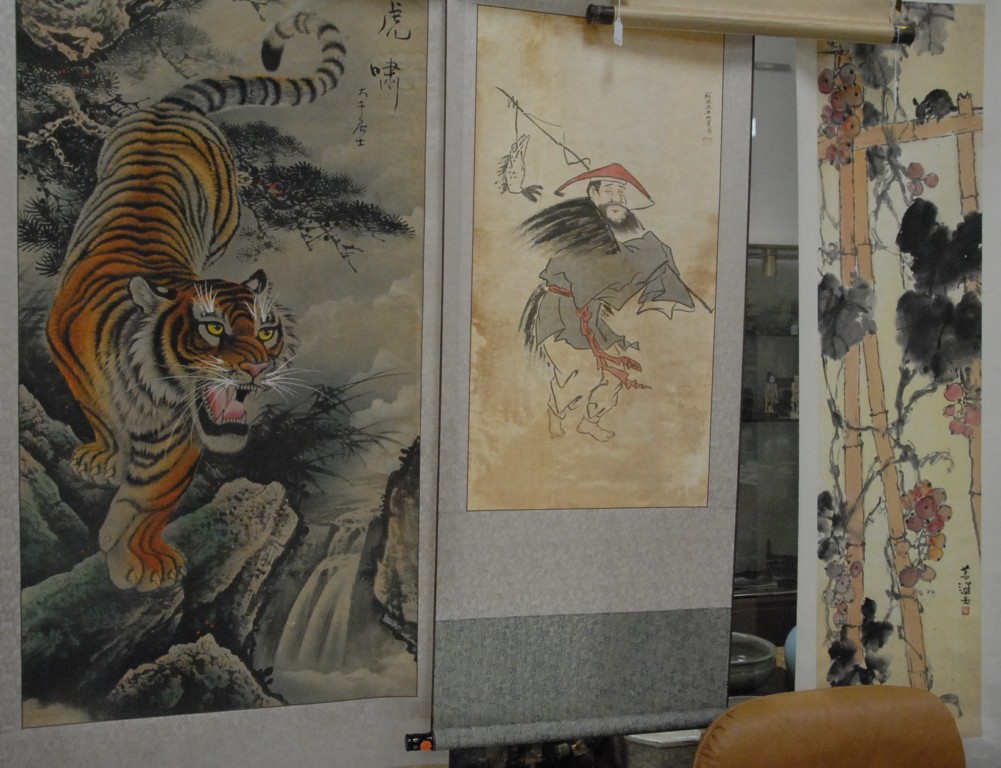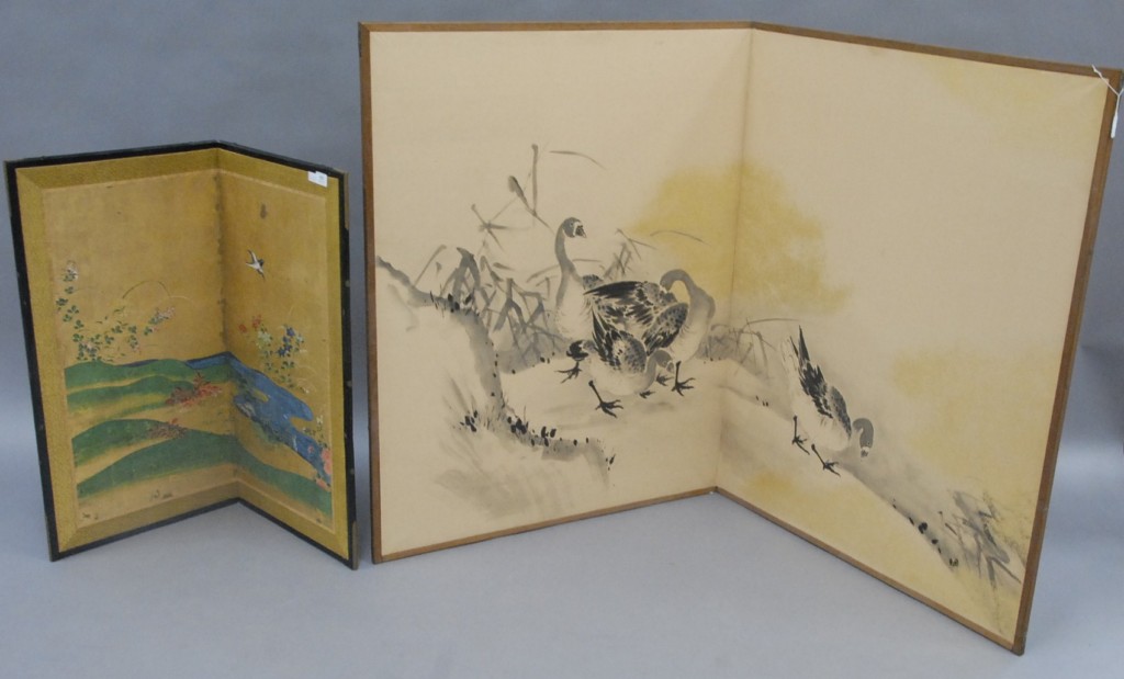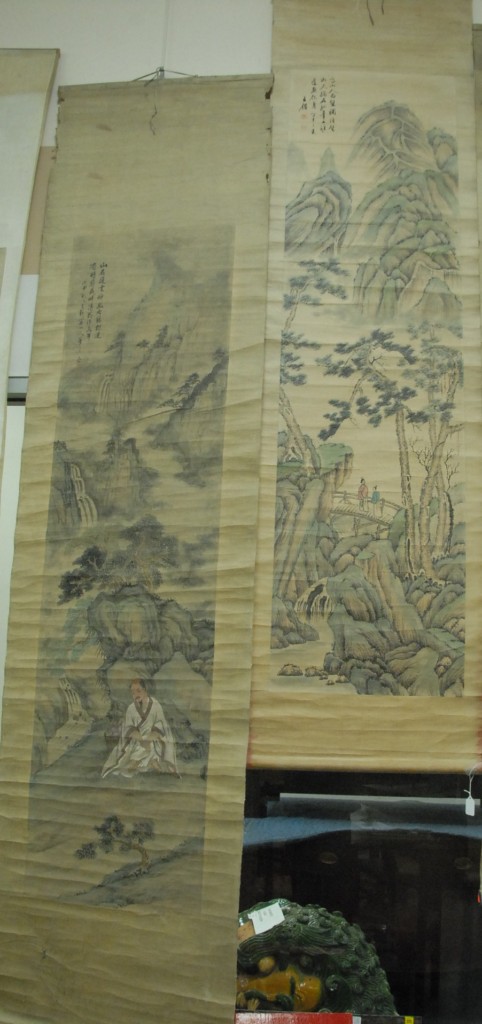 Group of seven watercolors on paper and silk, five are framed, two are not one of figure playing instrument 26 x 17, one of landscape 19 x 13, landscape with water buffalo 26 x 14, abstract 11 x 19, monkey playing with man sleeping 27 x 18, duck 27 x 13, and watercolor on silk of duck 31 x 15.